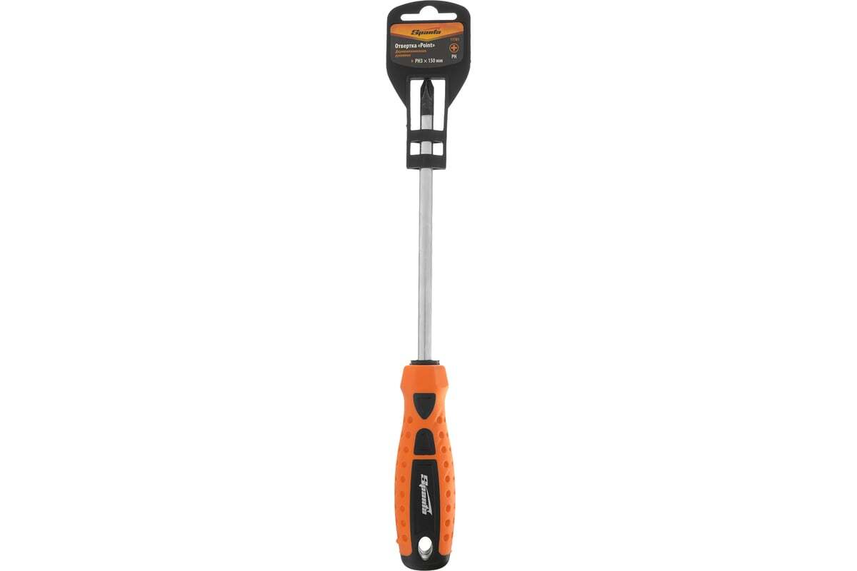 Отвертка Ph3х150мм, CrV, 2-х компонентная рукоятка SPARTA Point 11781 с крестовым рабочим профилем широко распространена для эксплуатации дома, в профессиональных мастерских, автосервисах, производственных участках и мн. др. Инструмент имеет удобную форму ручки, которая не проскальзывает в ладони и обеспечивает высокий крутящий момент.