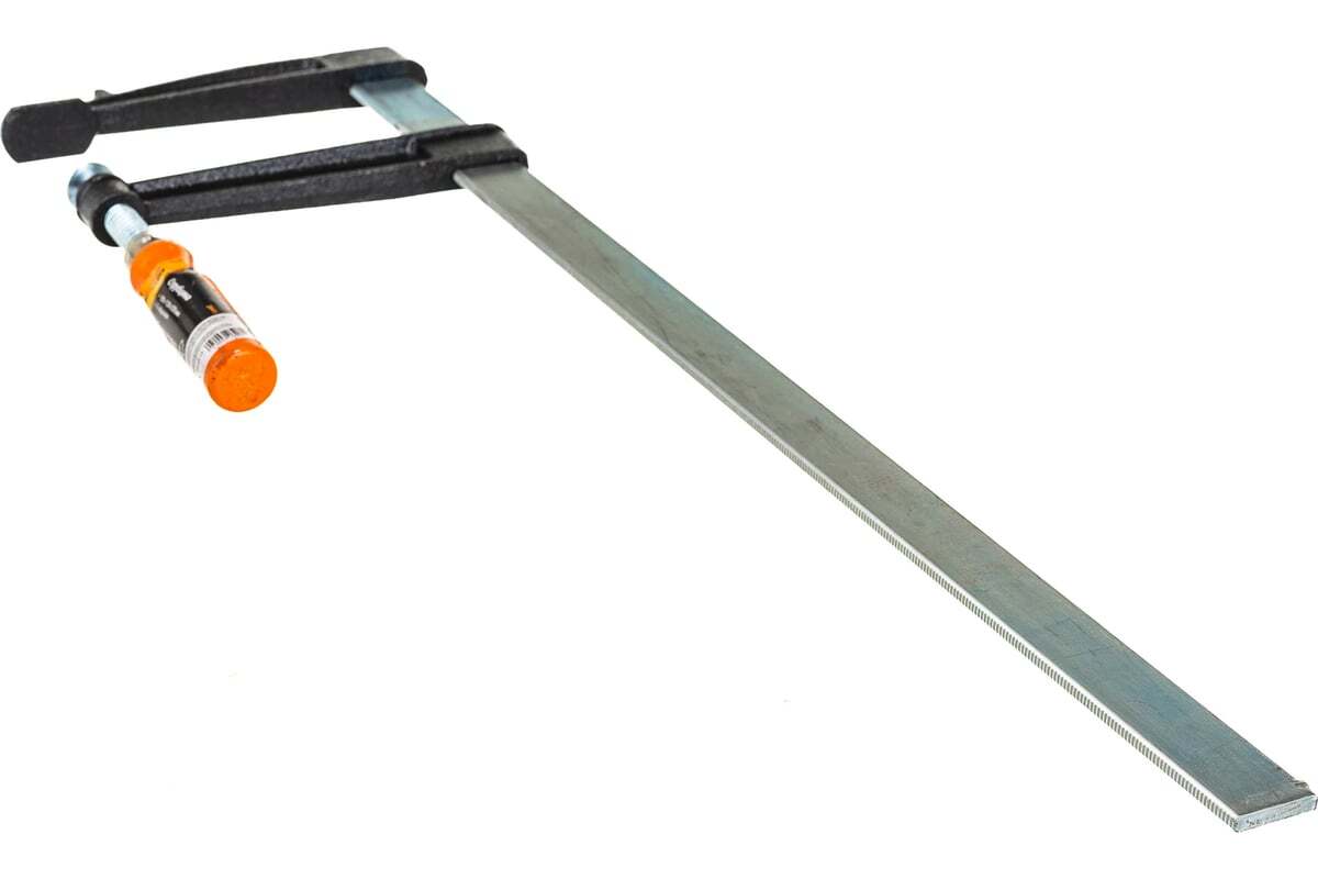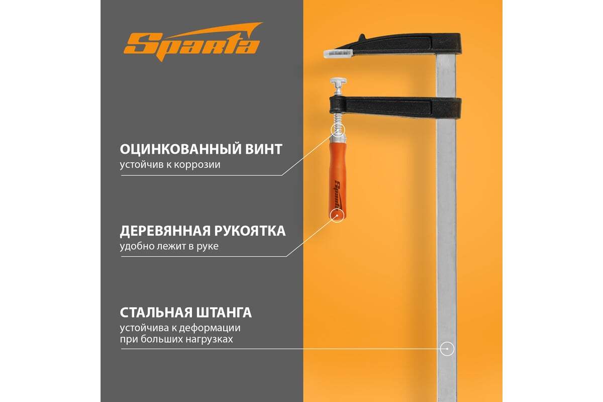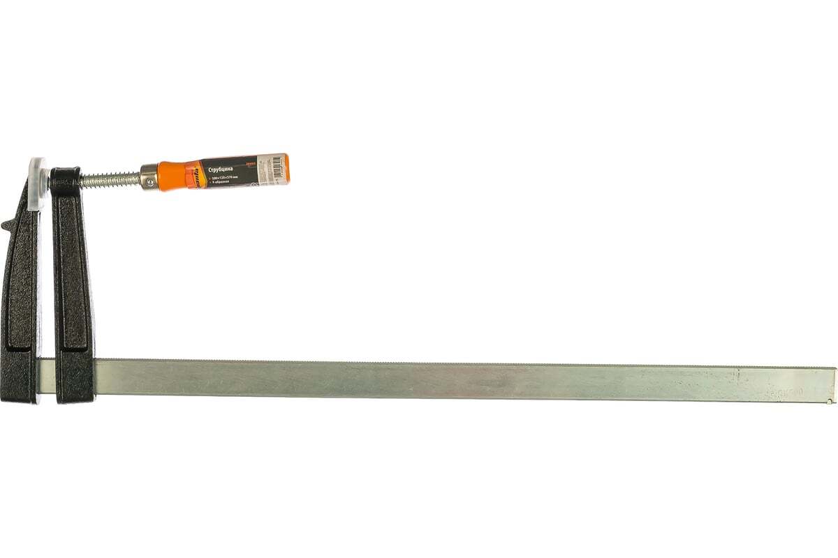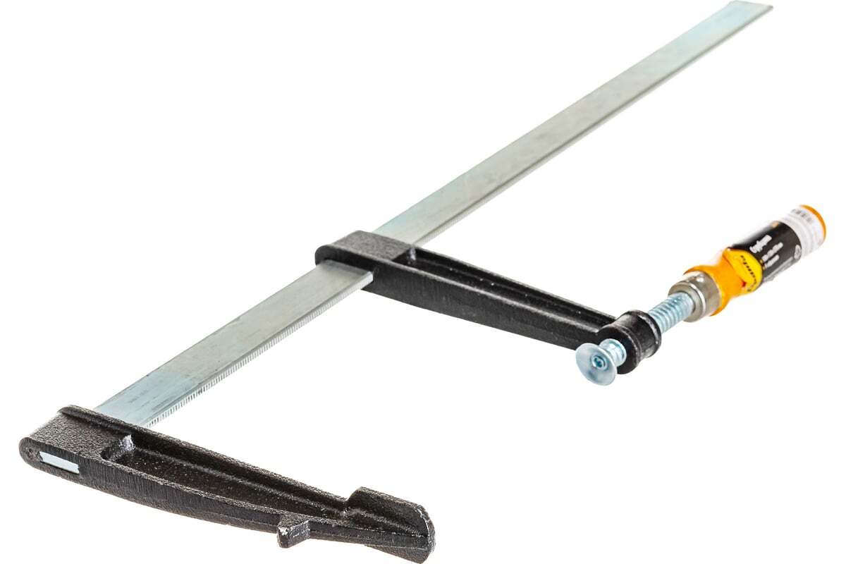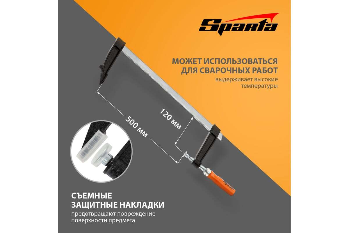 F-образная струбцина Sparta 204415, 500 х 120 х 570 мм, используется в столярном и слесарном деле и позволяет фиксировать заготовки из металла, древесины и других материалов для их соединения или обработки. Деталь помещают между губками, одна из которых подвижна и служит для регулировки величины захвата. Винтовой зажим позволяет прикладывать значительное усилие для надежности фиксации. Защитные накладки предотвращают повреждение детали. Элементы конструкции выдерживают высокую температуру, поэтому струбцина подходит для проведения сварочных работ, при этом пластиковые накладки необходимо снять.