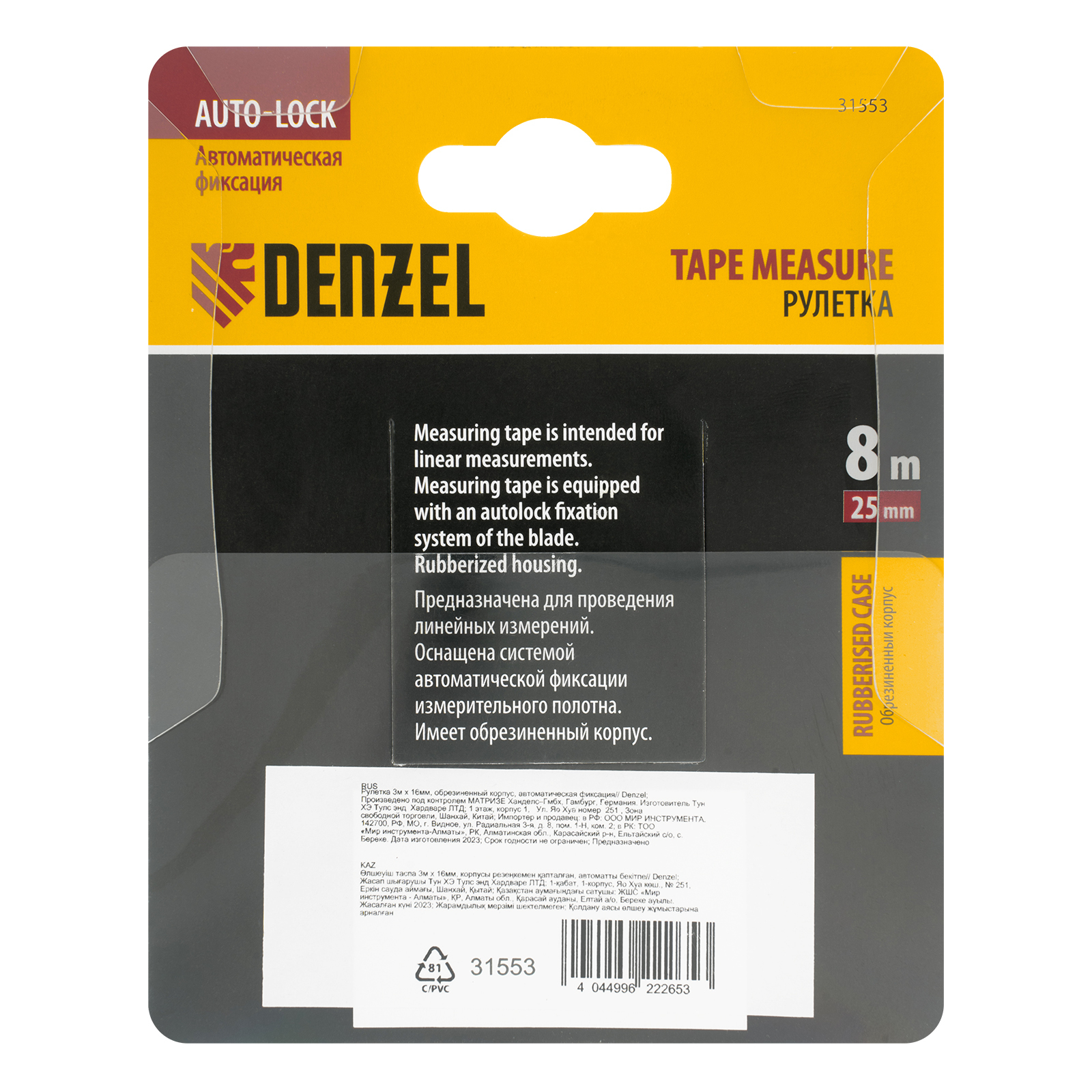 Рулетка 8м х 25мм, обрезиненный корпус, автоматическая фиксация Denzel 31553