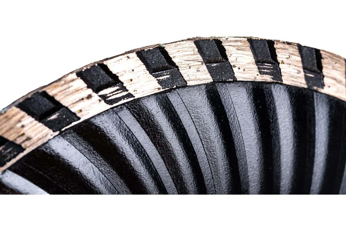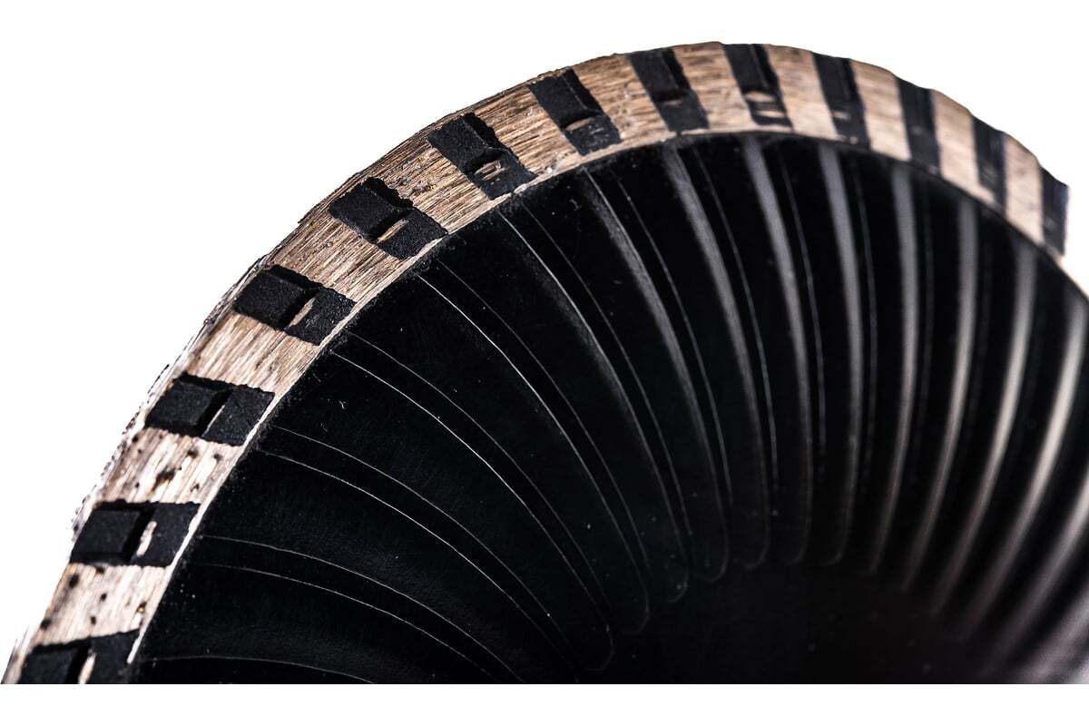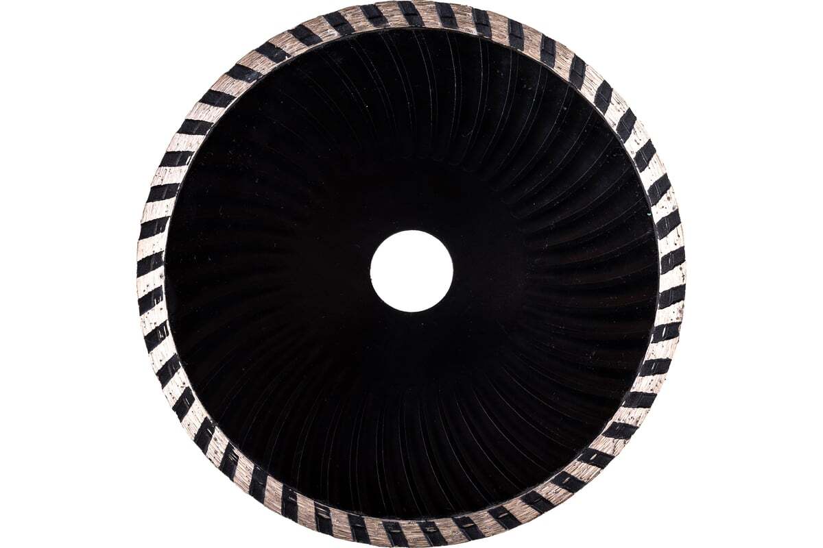Диск алмазный отрезной Turbo 150x22.2 мм SPARTA 731215 используется при сухой резке бетона, железобетона, мрамора. Металлическое основание имеет волнообразную форму, что способствует удалению продуктов пиления, улучшенному охлаждению и снижению нагрузки на инструмент. Основание штампованное, ширина режущей части 6 мм.
