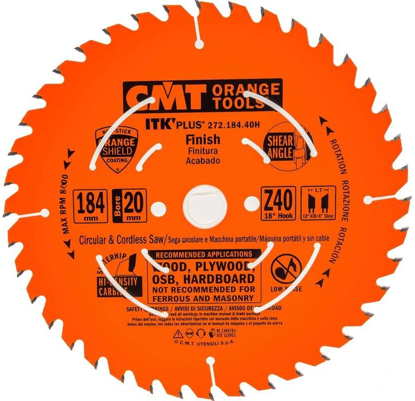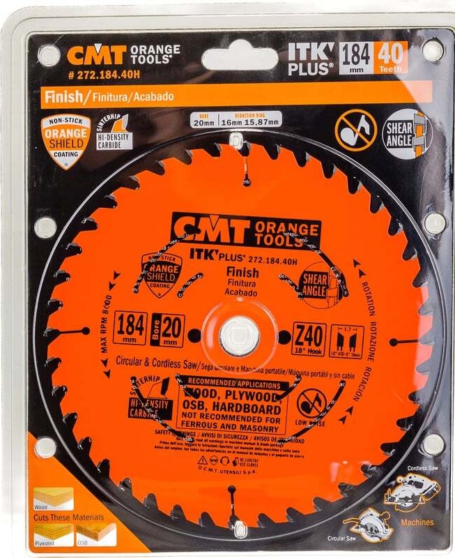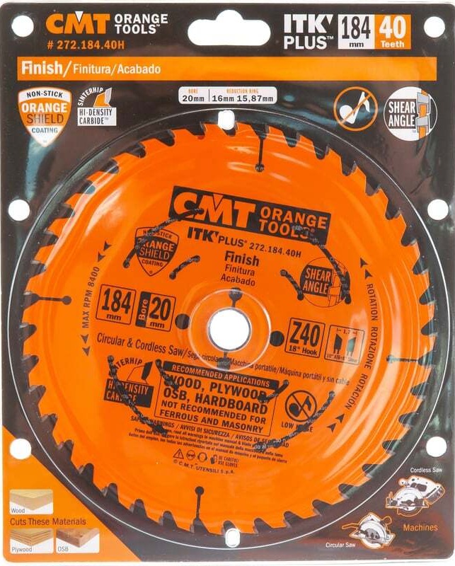 Пильный диск CMT 272.184.40H используется в ручных циркулярных и аккумуляторных пилах. Его применяют для получения тонкого продольного и поперечного пропила в мягкой и твердой древесине, а также в фанере. В комплекте с данным диском поставляются переходные кольца с посадочными диаметрами 15,87 мм и 16 мм.