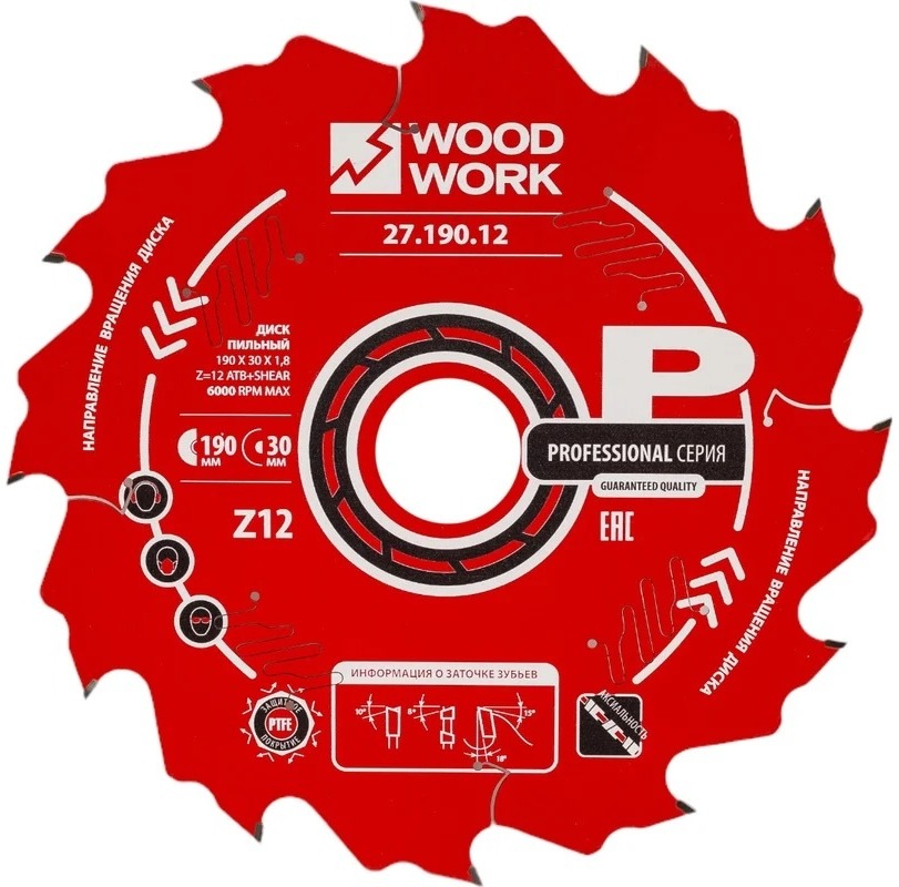 Диск пильный 190x30x1,8/1,1 A=18° ATB + 8° SHEAR Z=12 Woodwork 27.190.12