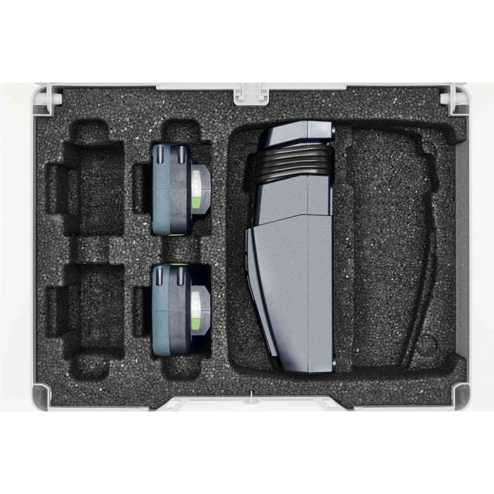 Комплект источников электропитания полностью удовлетворит Ваши потребности в электроэнергии, у Вас всегда под рукой будут два дополнительных аккумулятора и ещё одно зарядное устройство, которые хранятся в систейнере³, совместимом со всеми другими систейнерами Festool и идеально встраиваемом в автомобильную модульную систему bott.
