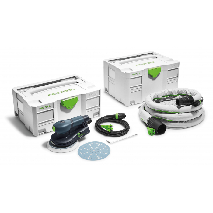 Разнообразная оснастка, например, всасывающий шланг в защитной оболочке и кабель plug it, шлифовальные тарелки трёх степеней жёсткости, промежуточная подложка и шлифовальный материал.