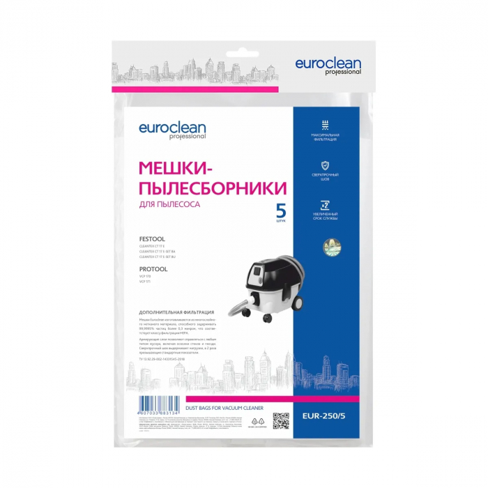 Мешки Euroclean изготавливаются из многослойного нетканого материала ProClean, способного задерживать 99,9995% частиц более 0,3 микрон что соответствует классу фильтрации HEPA.
