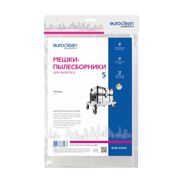 Мешки Euroclean изготавливаются из многослойного нетканого материала ProClean, способного задерживать 99,9995% частиц более 0,3 микрон что соответствует классу фильтрации HEPA.