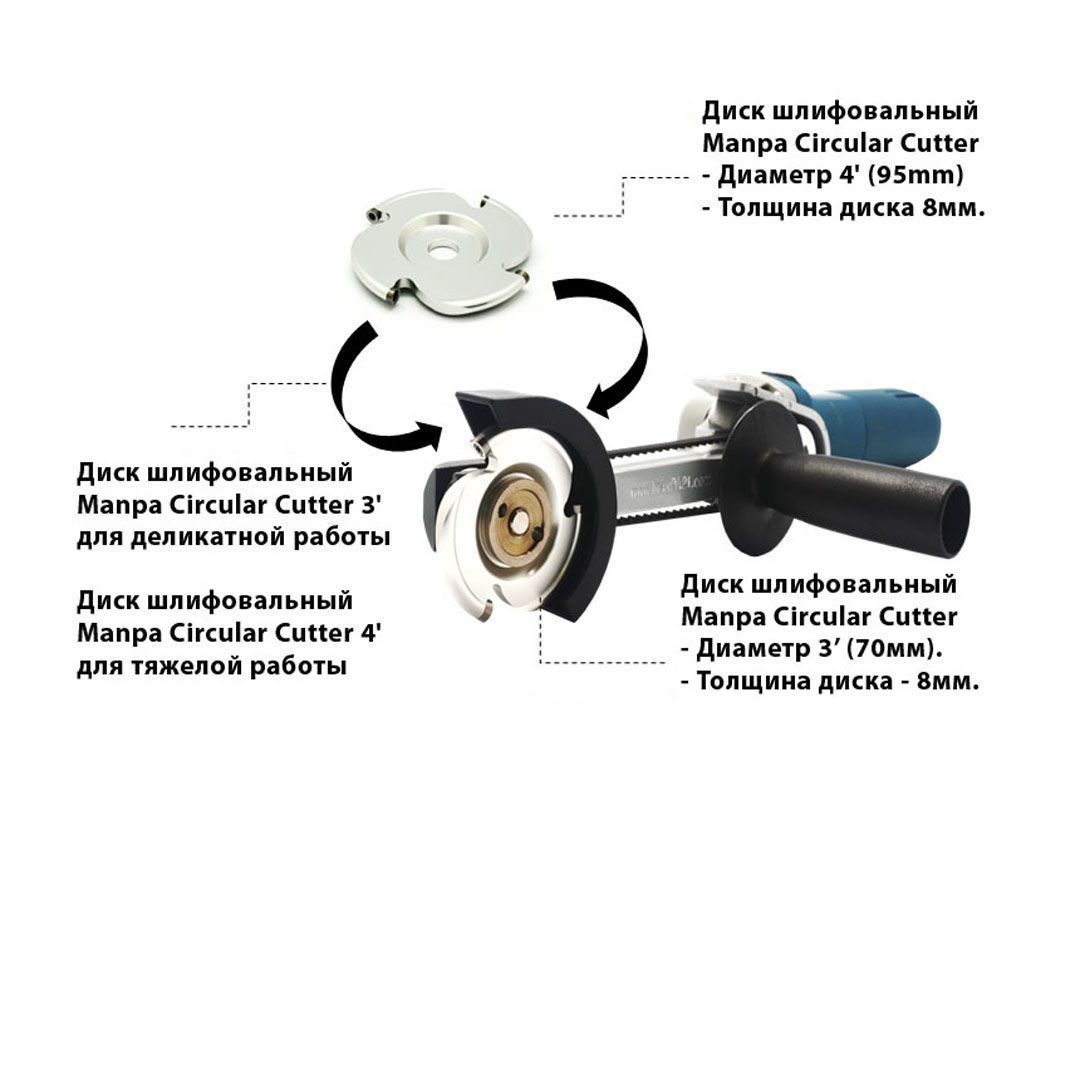 Насадка Manpa Multi Cutter Master. Предназначена для обработки и резки широкого спектра материалов: твердая древесина, в т.ч. и с частицами грязи, ламинат, пластик, нейлон, бакелит, органическое стекло, древесностружечная плита. Идеальна для резьбы по дереву, изготовления скульптуры и выборки углублений. Отличный контроль и баланс. Круглый нож и возможность его замены и заточки многократно увеличивает срок службы диска. Материал корпуса - алюминиевый сплав. Для заточки используется алмазный плоский напильник.