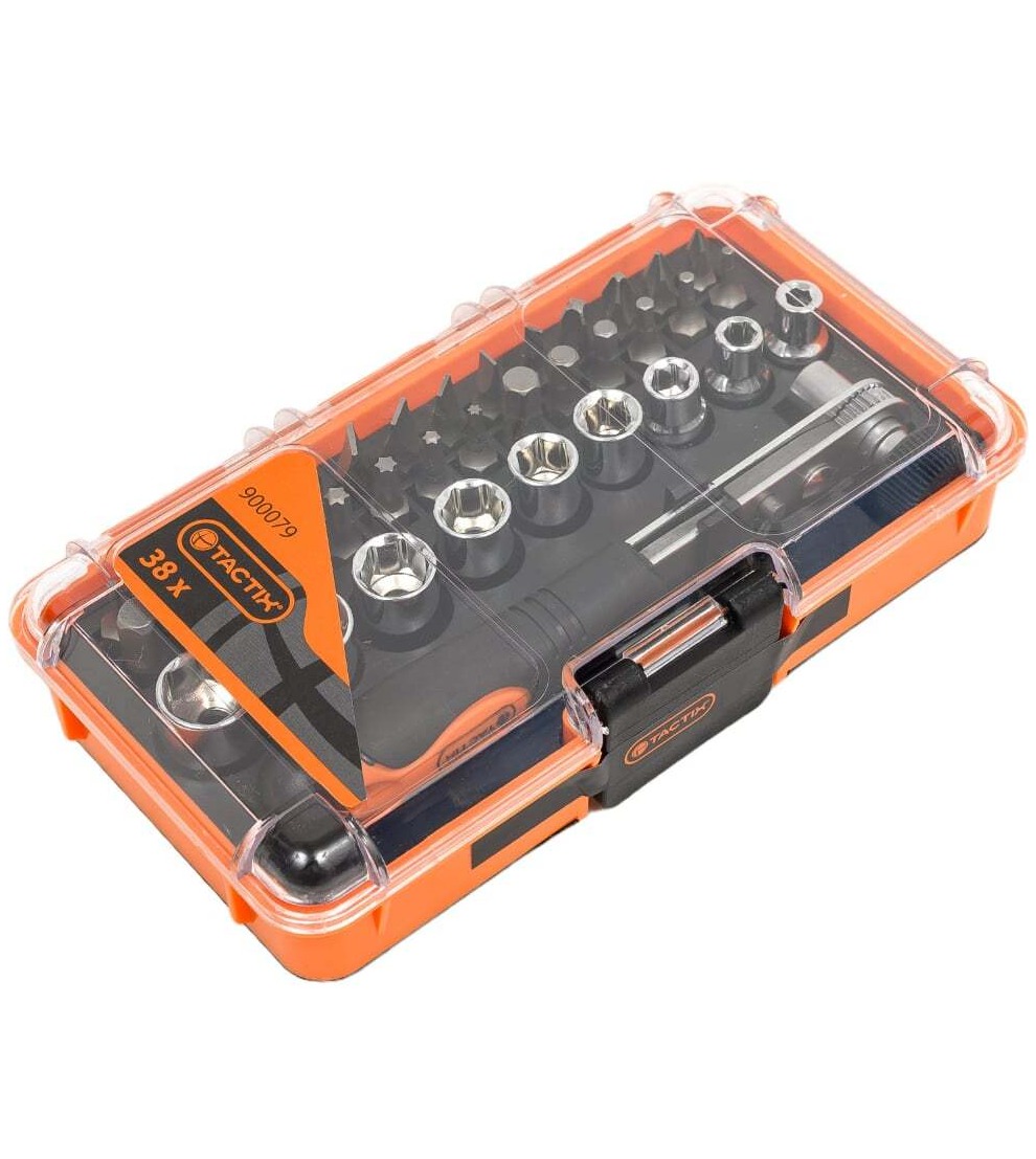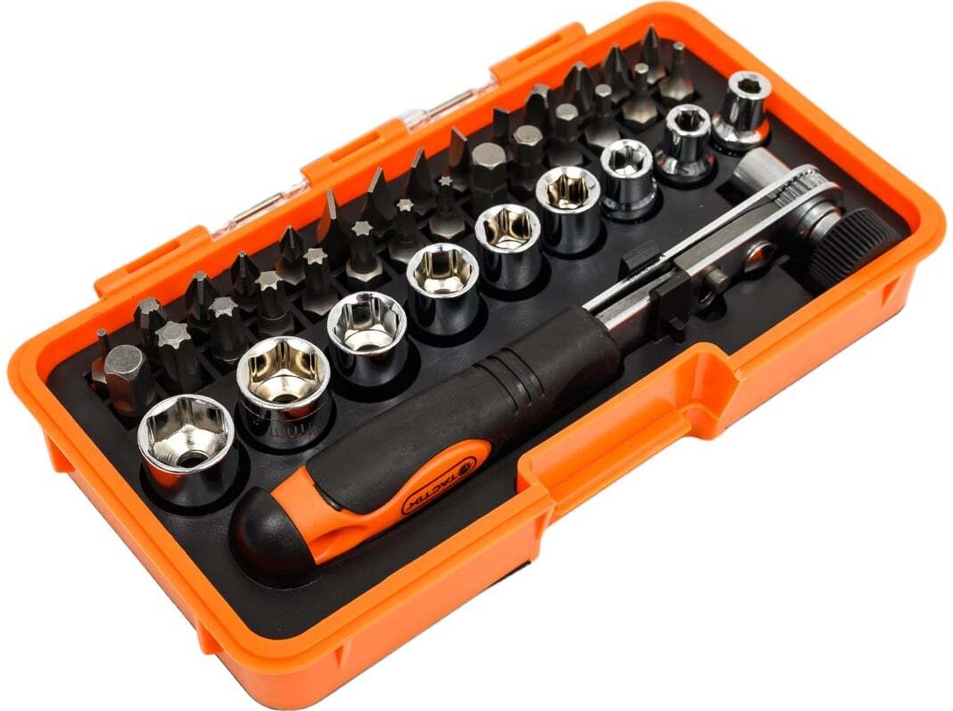 Набор головок TACTIX 1/4 и вставок из 38-ми предметов 900079 используется для работ с резьбовыми соединениями в процессе ремонта и монтажа. Вставки и быстросъемный патрон выполнены из хромованадиевой стали, что обеспечивает надежность и долговечность. Эргономичная рукоятка с храповым механизмом выполнена с учетом анатомических особенностей ладони, благодаря чему подходит для продолжительной работы без усталости руки. Набор поставляется в пластиковом кейсе для удобного хранения и транспортировки.