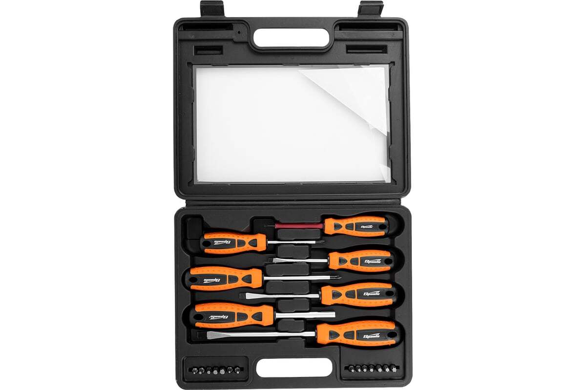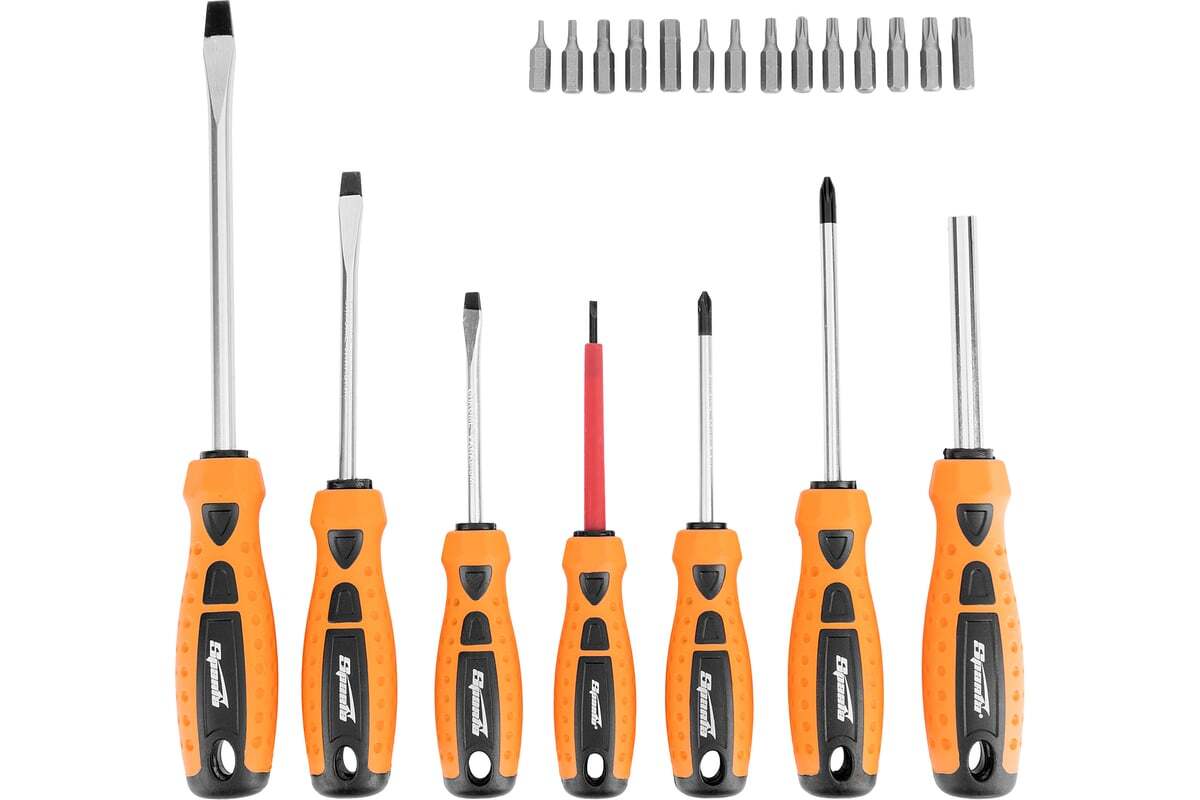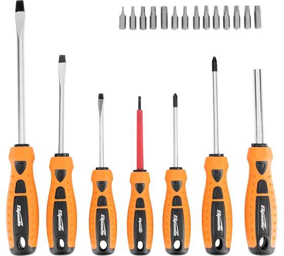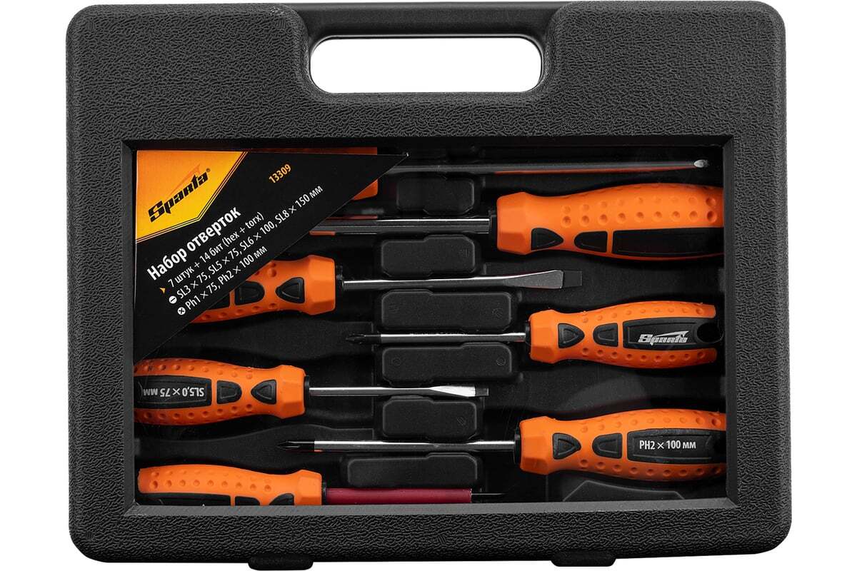 Набор отверток, CrV, SPARTA 13309 применяется для монтажа резьбовых соединений. В комплекте 21 предмет (отвертки с профилем SL 3 х 75, 5 х 75, 6 х 100, 7 х 150 мм, PH1 x 75, 2 x 100 мм). Стержни выполнены из стали. Твердость материала 46 HRc. Рукоятки эргономичной формы, с противоскользящим покрытием. Имеются отверстия для подвеса.