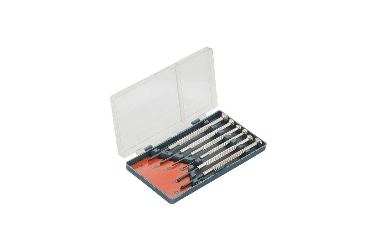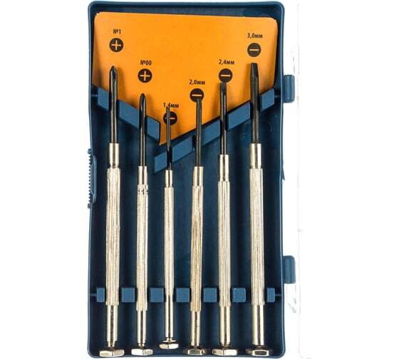 Набор отверток для точной механики SPARTA 133445 предназначен для работ с мелкими деталями. В наборе 6 отверток ( №0; №1; 1,4 мм; 2,0 мм; 2,4 мм; 3,0 мм. ). Рукоятки изготовлены из стали, со свободно вращающимися затыльниками. Набор упакован в удобный пластиковый бокс.