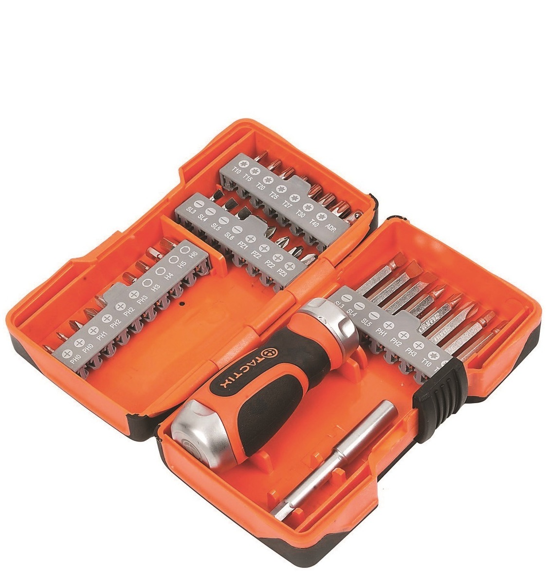 - Вставки 25 мм: SL3, SL4, SL5, SL6; PH0, PH1 (2 шт), PH2 (2 шт), PH3; H3, H4, H5, H6; T10, T15, T20, T25, T27, T30, T40; PZ1, PZ2 (2 шт), PZ3