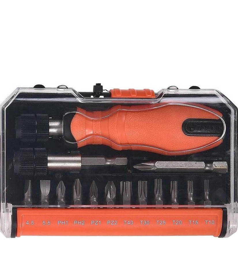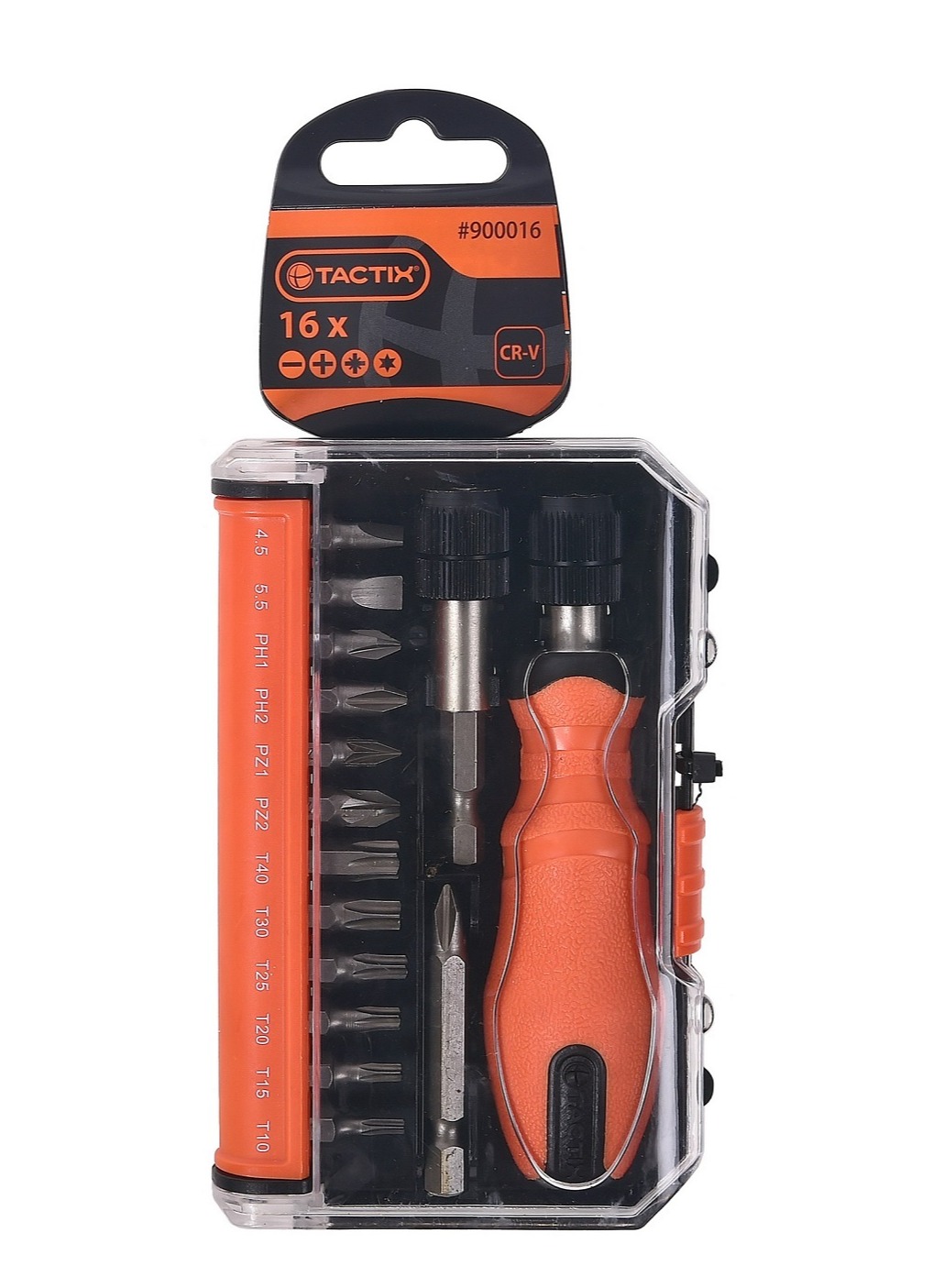 Набор вставок TACTIX из 16-ти предметов, SL, PH, PZ, TORX 900016 используется для работ с резьбовыми соединениями в процессе ремонта и монтажа. Вставки и быстросъемный патрон выполнены из хромованадиевой стали, что обеспечивает надежность и долговечность. Эргономичная рукоятка выполнена с учетом анатомических особенностей ладони, благодаря чему подходит для продолжительной работы без усталости руки. Набор поставляется в пластиковом кейсе для удобного хранения и транспортировки.