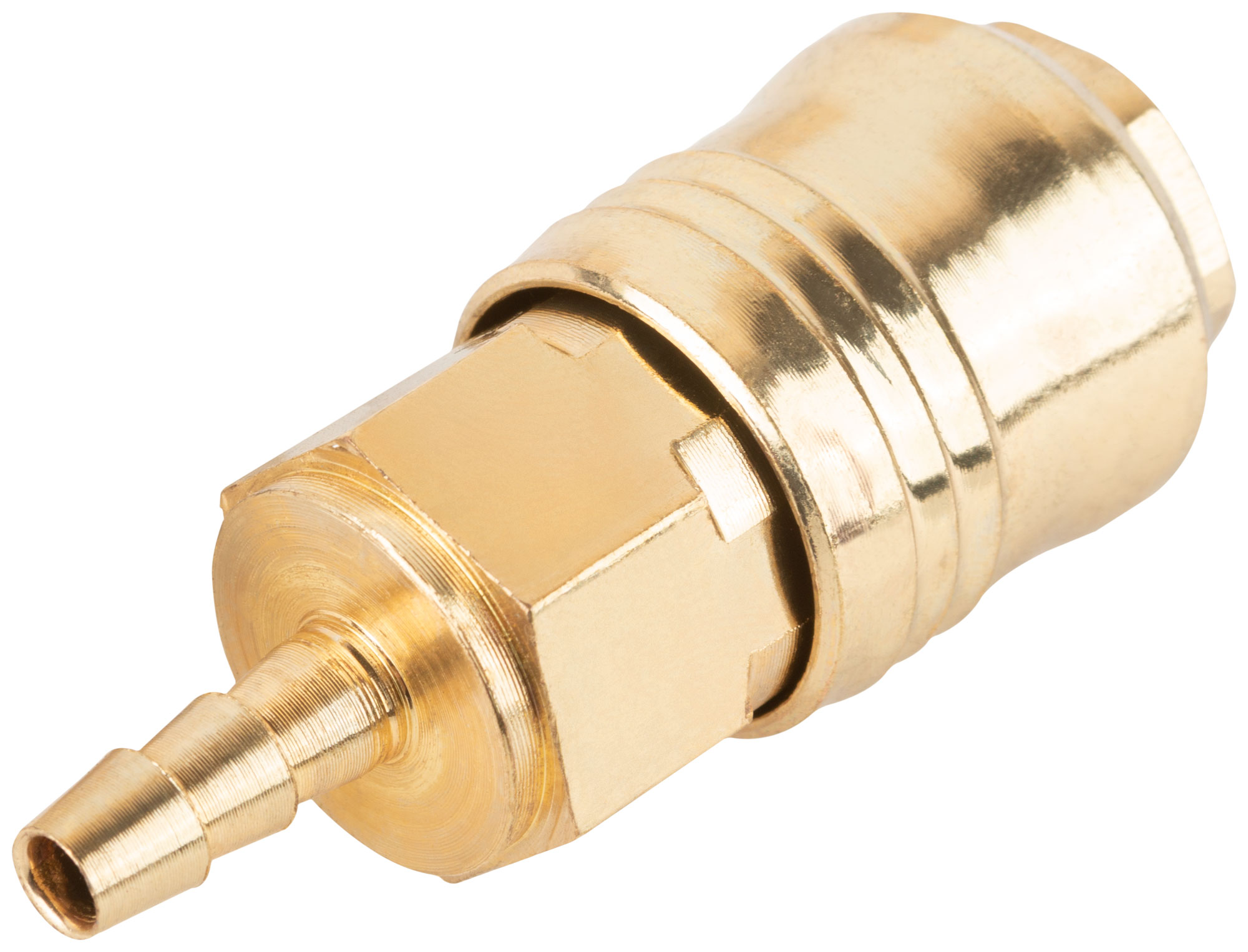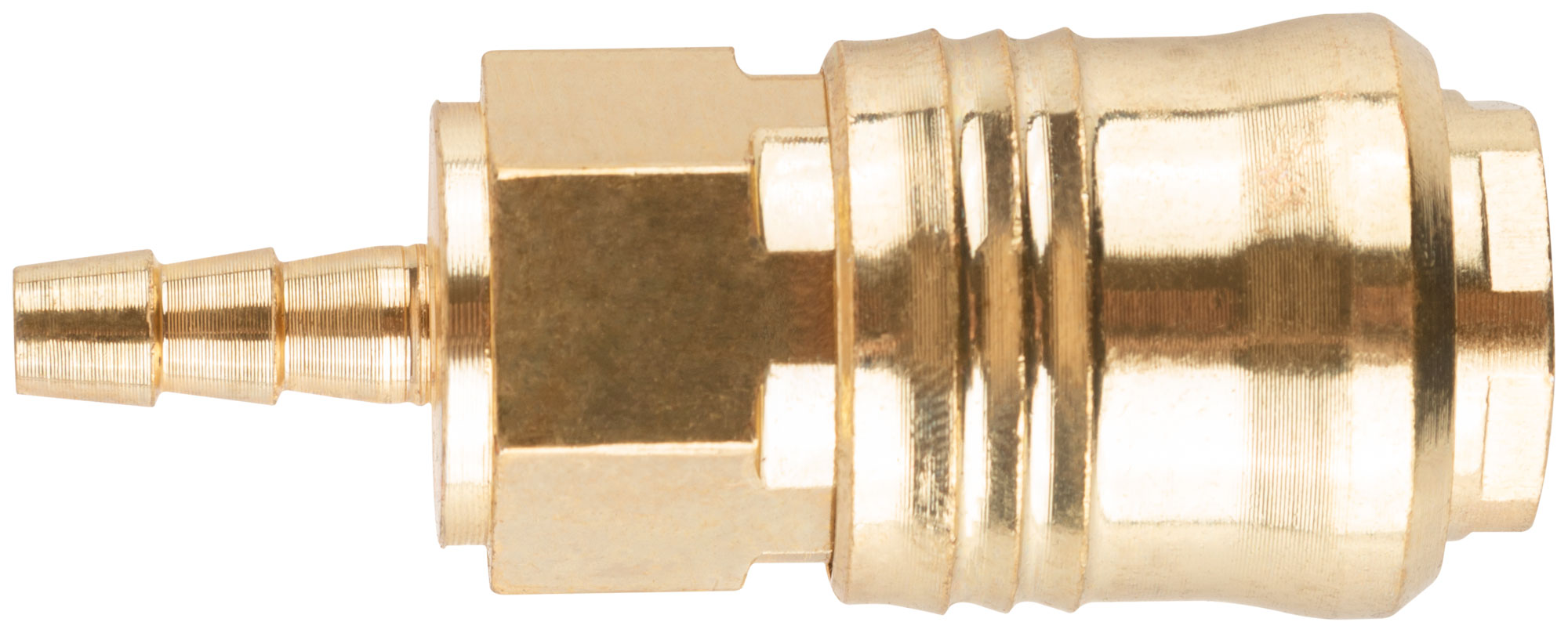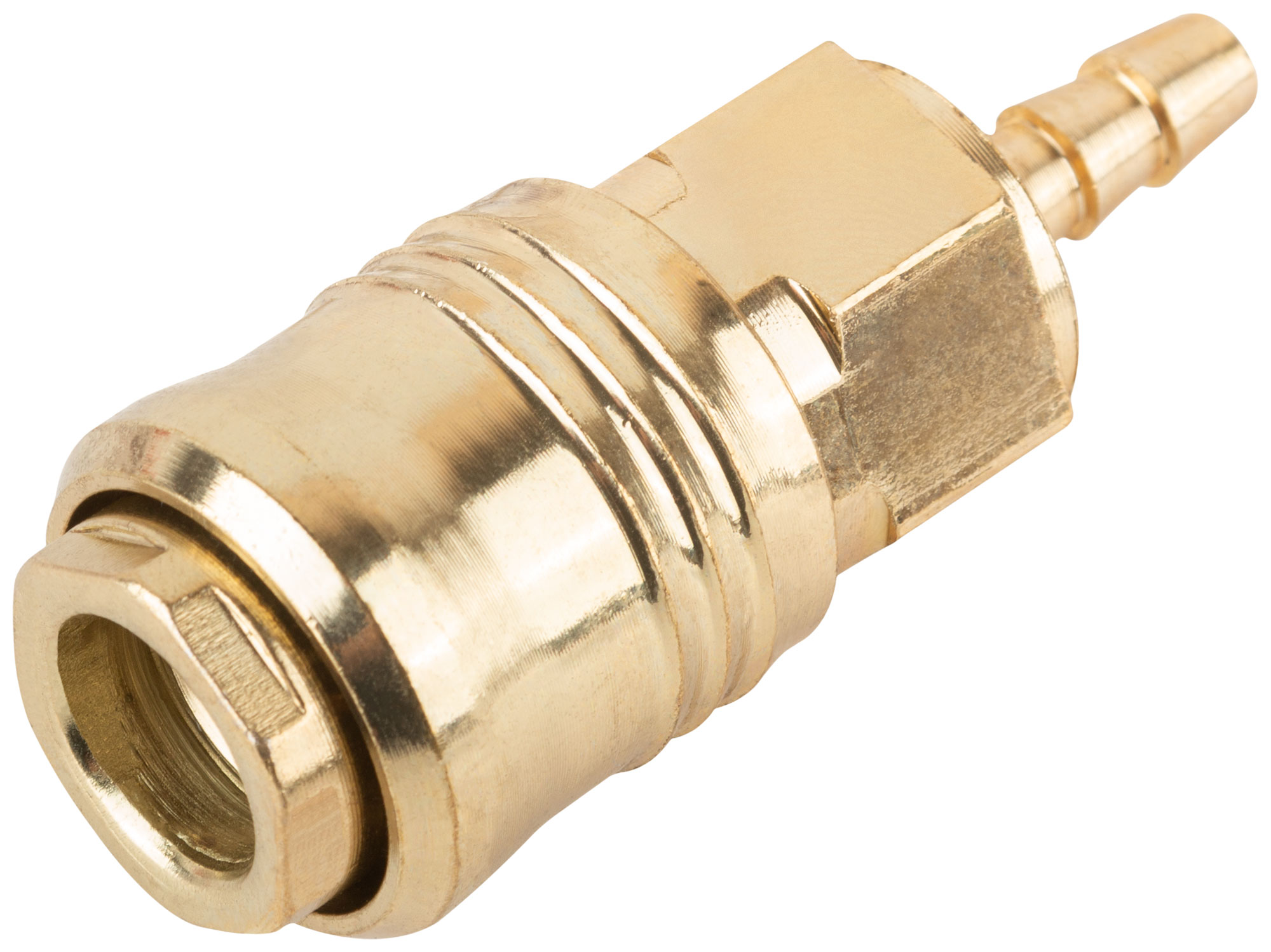 Адаптер с запорным клапаном. Внутреннее быстросъемное соединение - адаптер-соединитель (елочка) 6 мм. С прямым подключением шланга, под ключ S=20. Совместим с ниппелями всех типов. Материал: латунь.