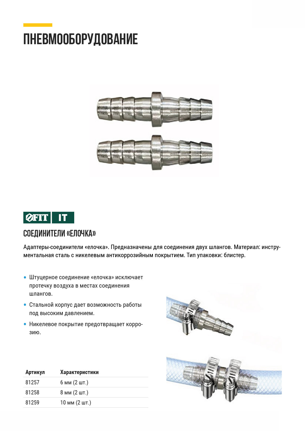 Адаптеры-соединители "елочка". Предназначены для соединения двух шлангов. Материал: инструментальная сталь с никелевым антикоррозийным покрытием. Упаковка: блистер.