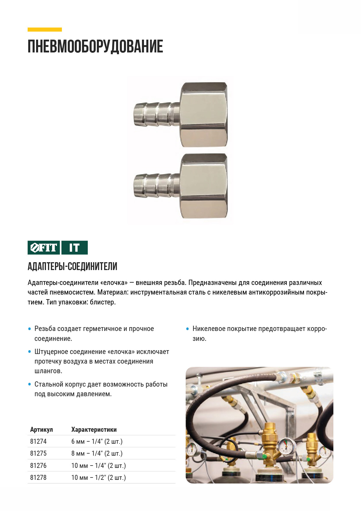 Адаптеры-соединители "елочка" - вутренняя резьба. Предназначены для соединения различных частей пневмосистем. Материал: инструментальная сталь с никелевым антикоррозийным покрытием. Упаковка: блистер.