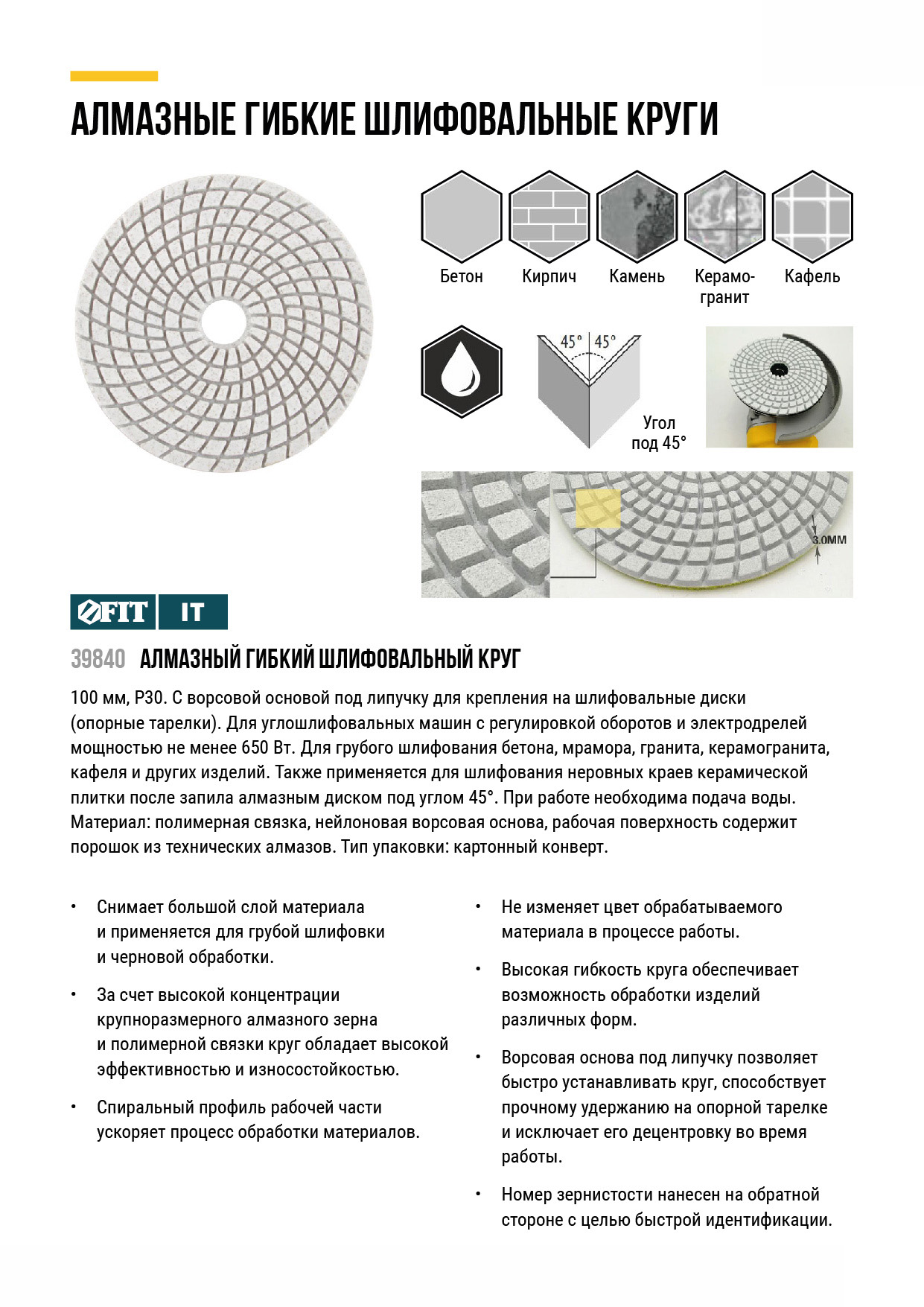 С ворсовой основой под липучку для крепления на шлифовальные диски (опорные тарелки). Для углошлифовальных машин с регулировкой оборотов и электродрелей мощностью не менее 650 Вт. Для шлифования и полирования бетона, мрамора, гранита, керамогранита, кафеля и других изделий. Также применяется для шлифования неровных краев керамической плитки после запила алмазным диском под углом 45° (39841-39844). При работе необходима подача воды. Материал: полимерная связка, нейлоновая ворсовая основа, рабочая поверхность содержит порошок из технических алмазов. Упаковка: картонный конверт.