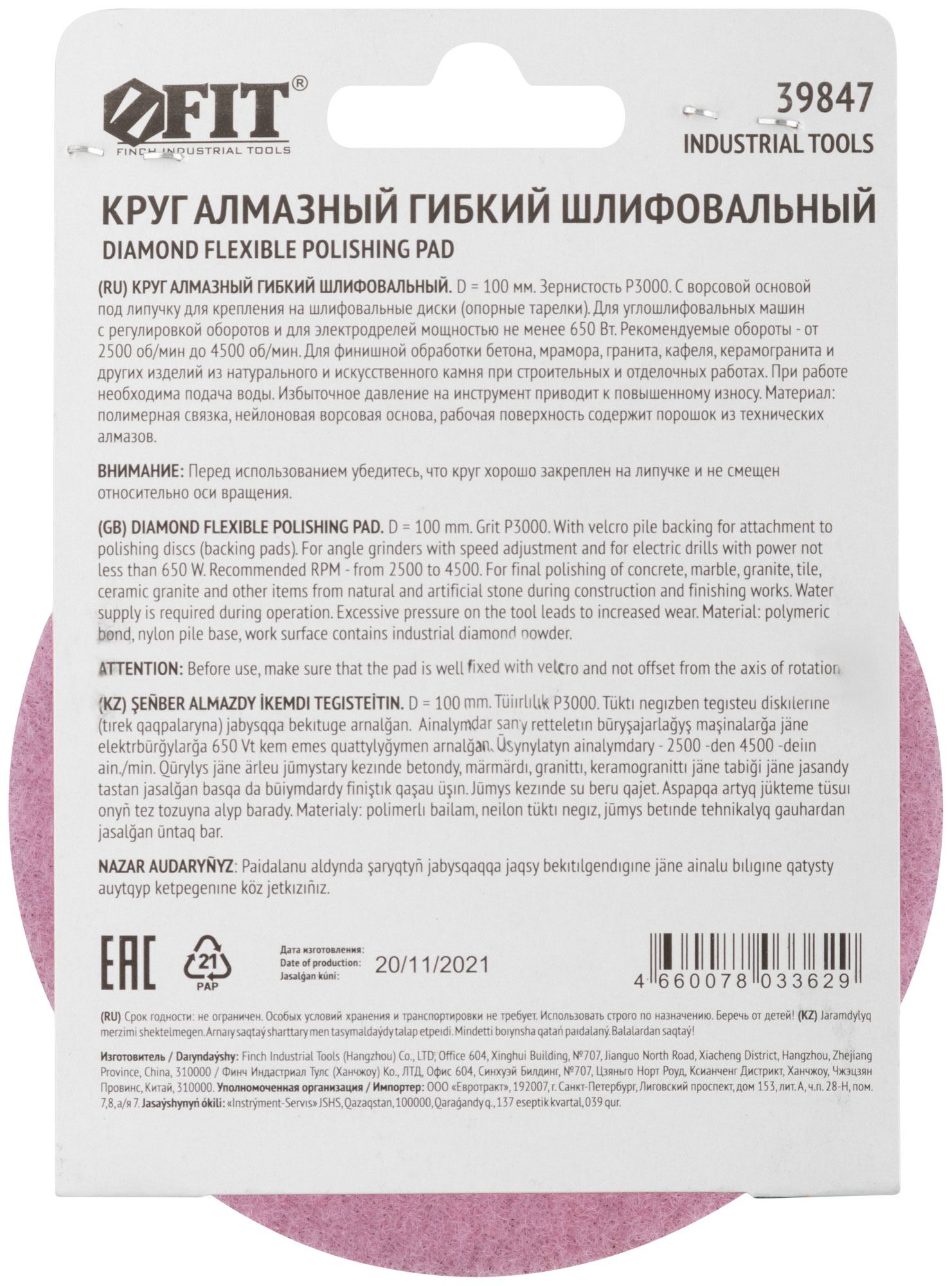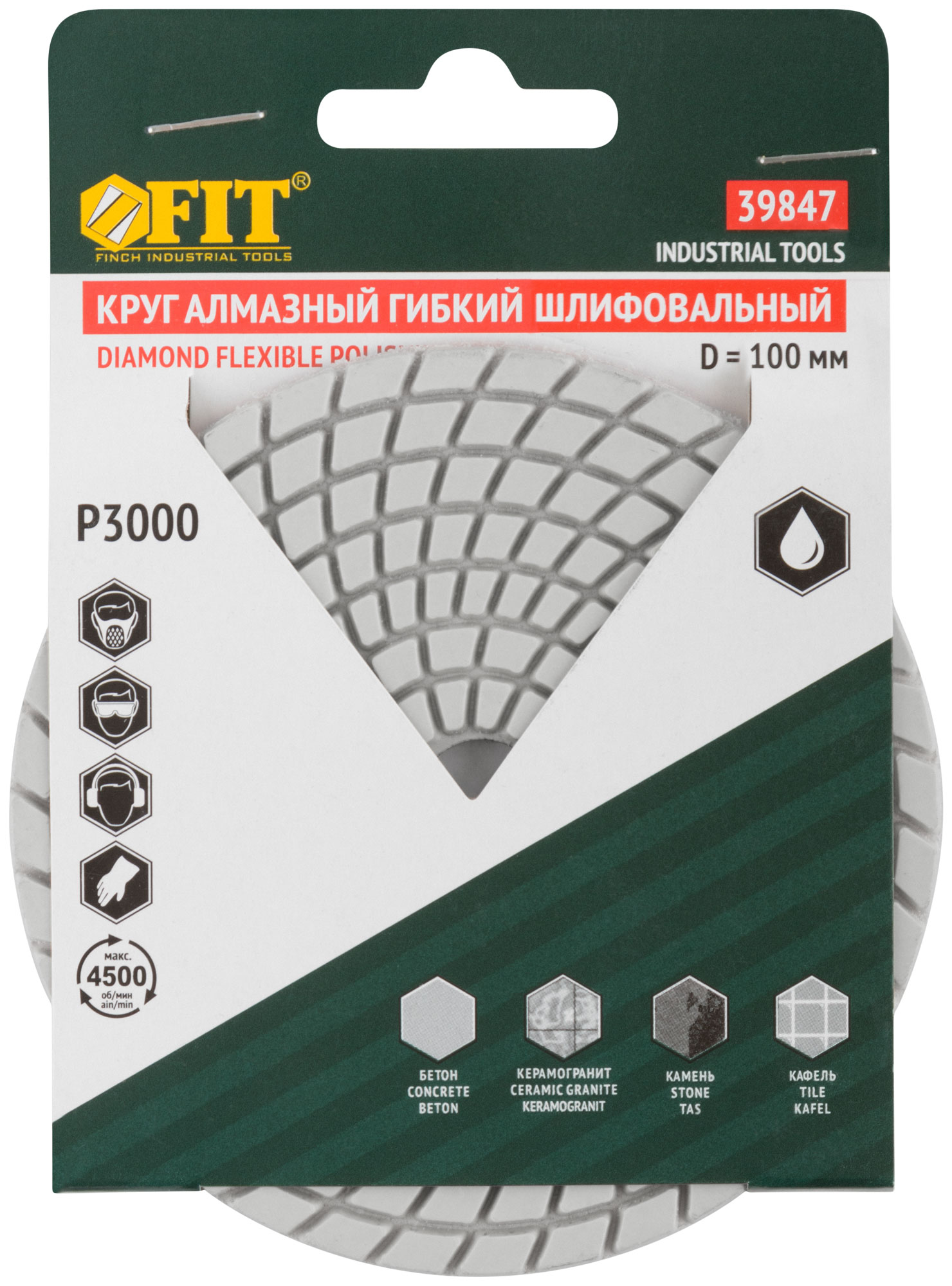 С ворсовой основой под липучку для крепления на шлифовальные диски (опорные тарелки). Для углошлифовальных машин с регулировкой оборотов и электродрелей мощностью не менее 650 Вт. Для шлифования и полирования бетона, мрамора, гранита, керамогранита, кафеля и других изделий. Также применяется для шлифования неровных краев керамической плитки после запила алмазным диском под углом 45° (39841-39844). При работе необходима подача воды. Материал: полимерная связка, нейлоновая ворсовая основа, рабочая поверхность содержит порошок из технических алмазов. Упаковка: картонный конверт.