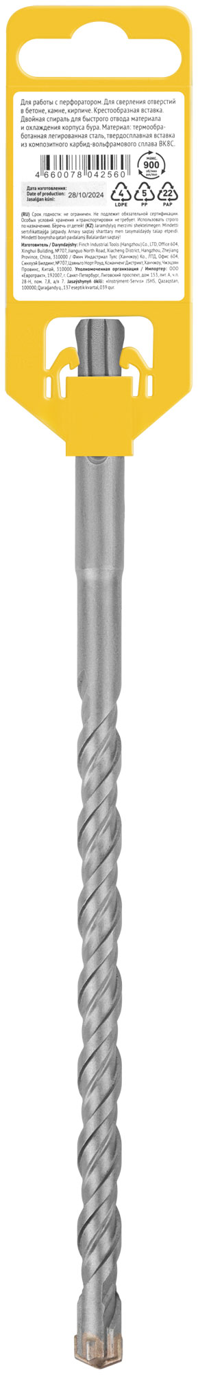 Профи. SDS-PLUS хвостовик. По бетону, камню, кирпичу. Для перфоратора. Для профессионального использования. Износостойкий. Цельна крестообразная вставка с добавлением 8% кобальта для повышенной производительности. Двойная спираль для быстрого отвода материала и охлаждения корпуса бура. Материал: легированная инструментальная сталь, твердосплавная вставка из карбида вольфрама ВК8С. Упаковка: пластиковый подвес.