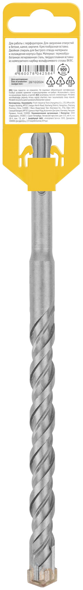 Профи. SDS-PLUS хвостовик. По бетону, камню, кирпичу. Для перфоратора. Для профессионального использования. Износостойкий. Цельна крестообразная вставка с добавлением 8% кобальта для повышенной производительности. Двойная спираль для быстрого отвода материала и охлаждения корпуса бура. Материал: легированная инструментальная сталь, твердосплавная вставка из карбида вольфрама ВК8С. Упаковка: пластиковый подвес.