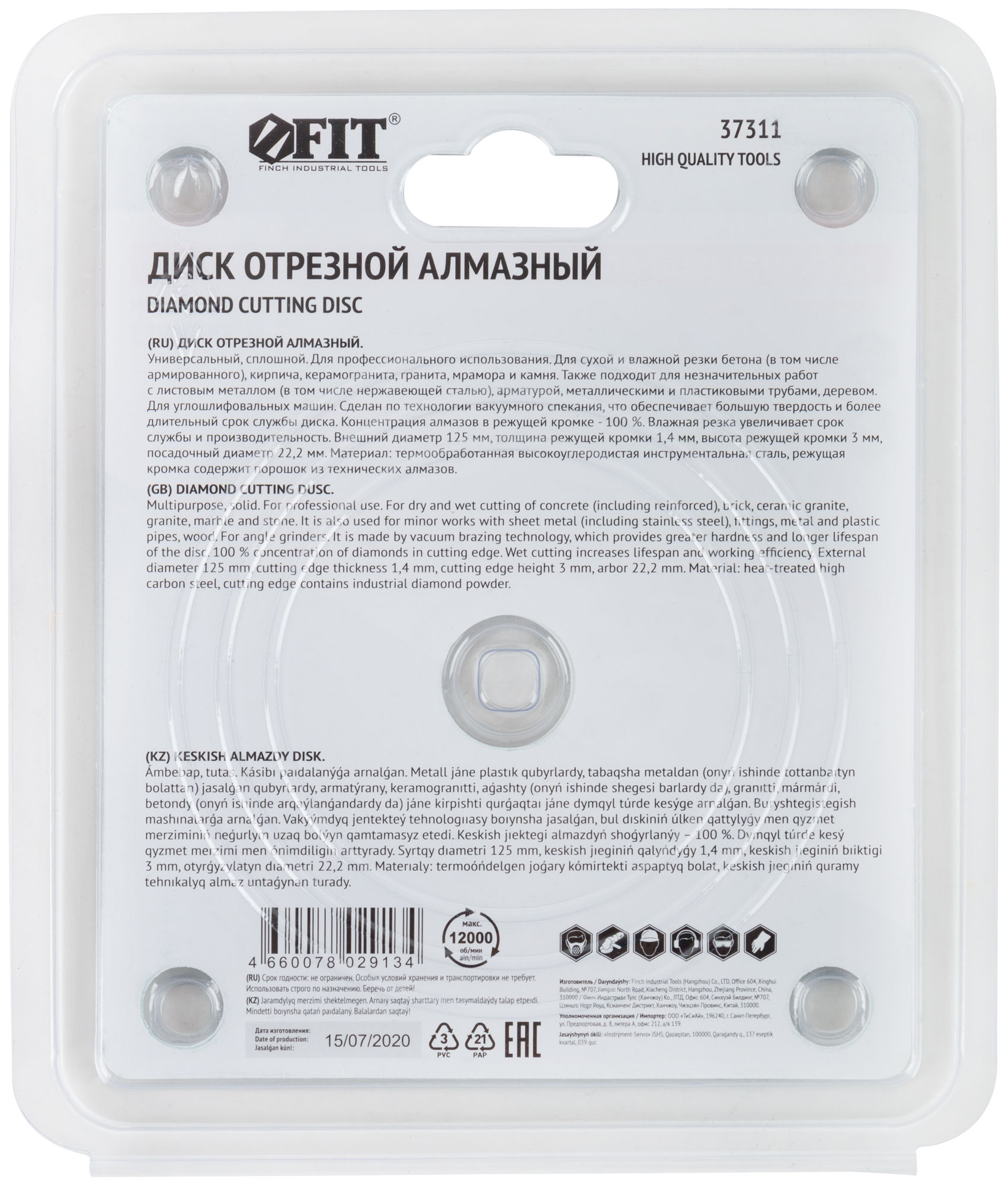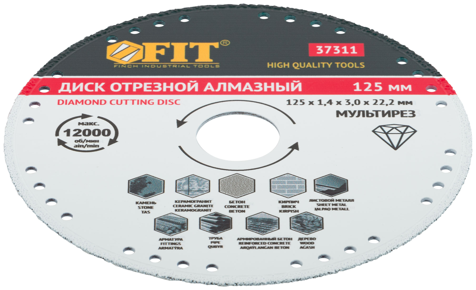 «Мультирез». Универсальный сплошной. Изготовлен по технологии вакуумного спекания. Для сухой и влажной резки. Высокая плотность расположения алмазов в режущем слое позволяет использовать диск для резки бетона, кирпича, гранита, мрамора и камня, арматуры, металлического профиля. Посадочный диаметр 22,2 мм. Материал: термообработанная высокоуглеродистая инструментальная сталь, режущая кромка содержит порошок из=технических алмазов. Упаковка: блистер.