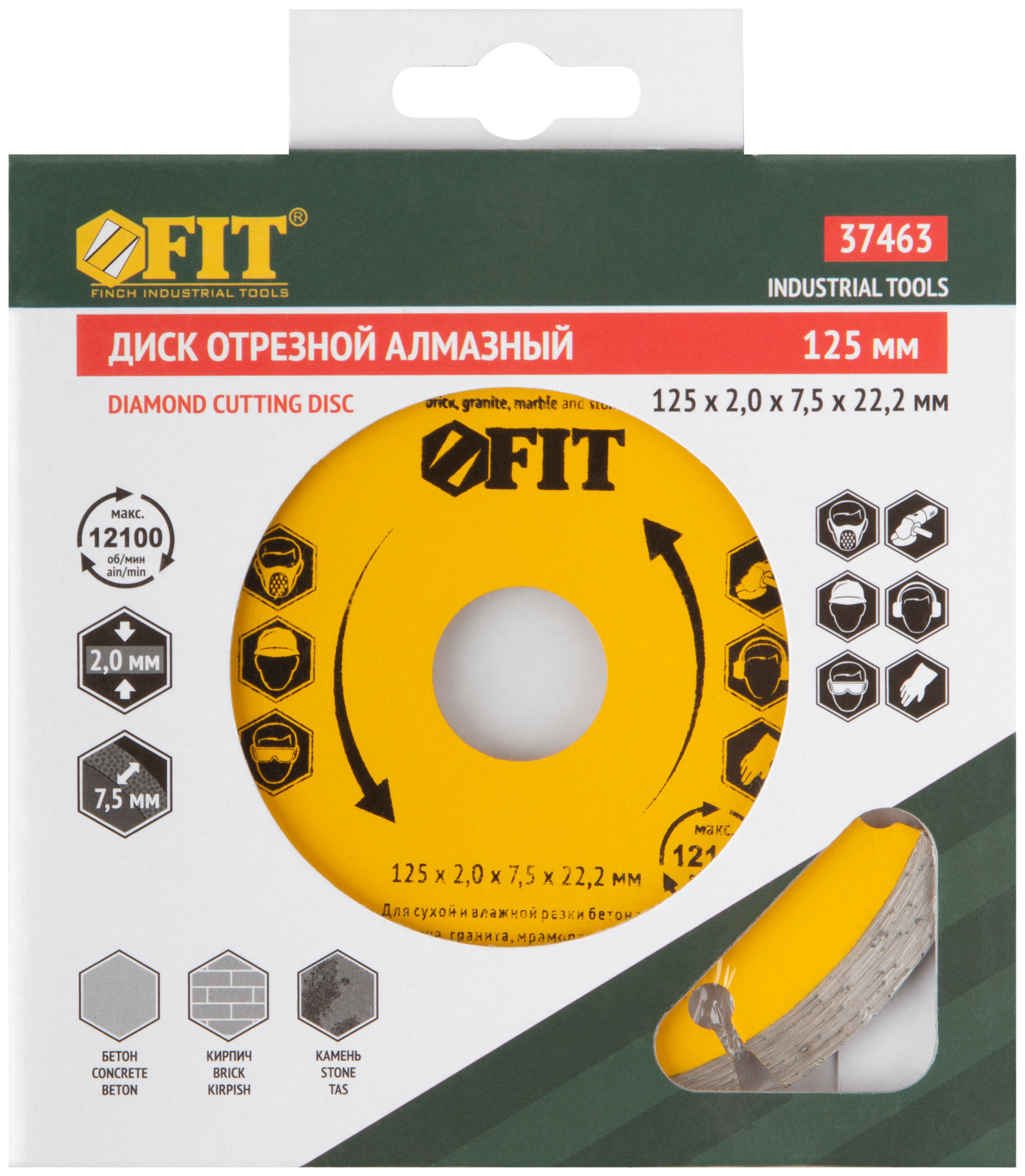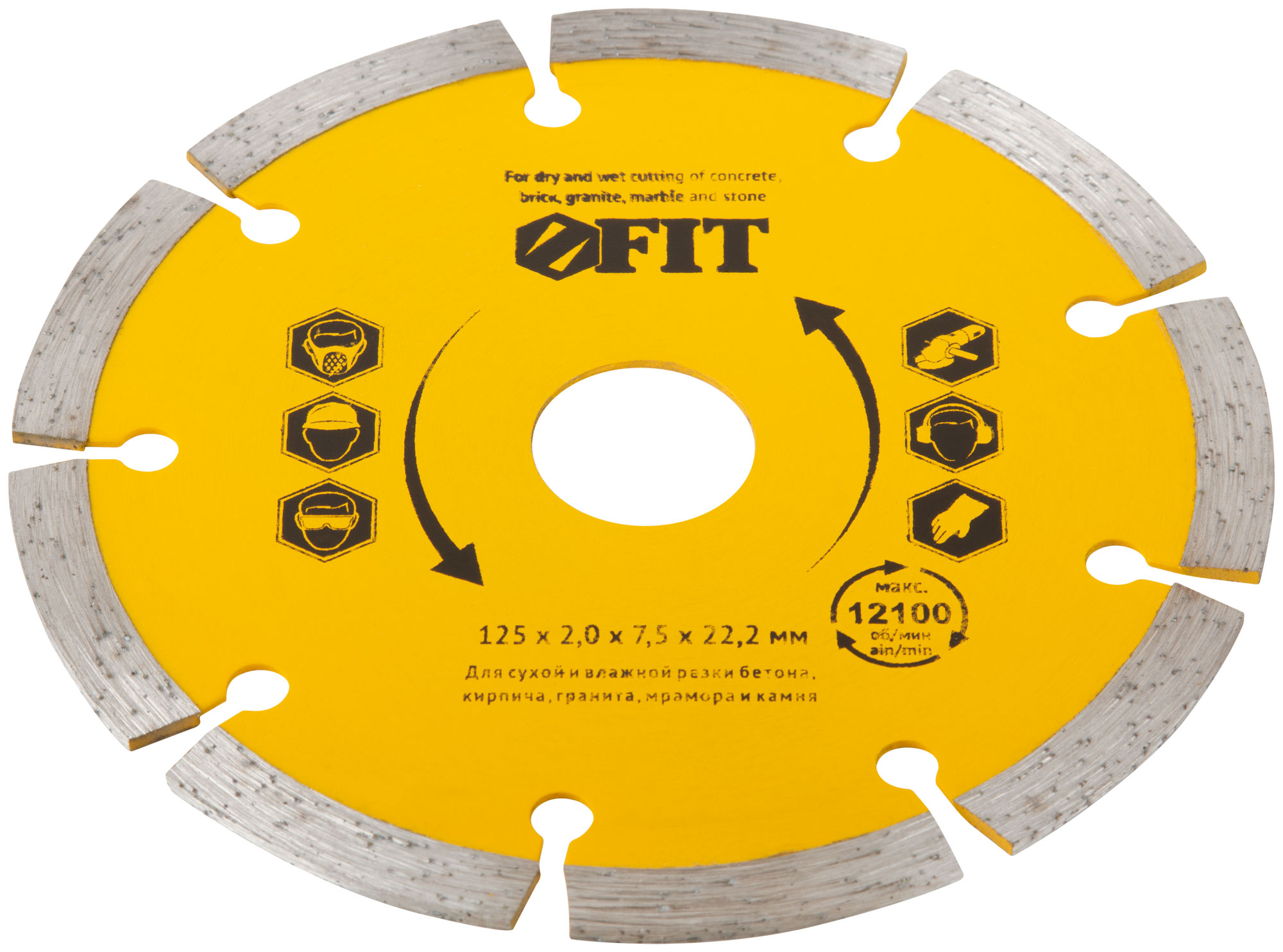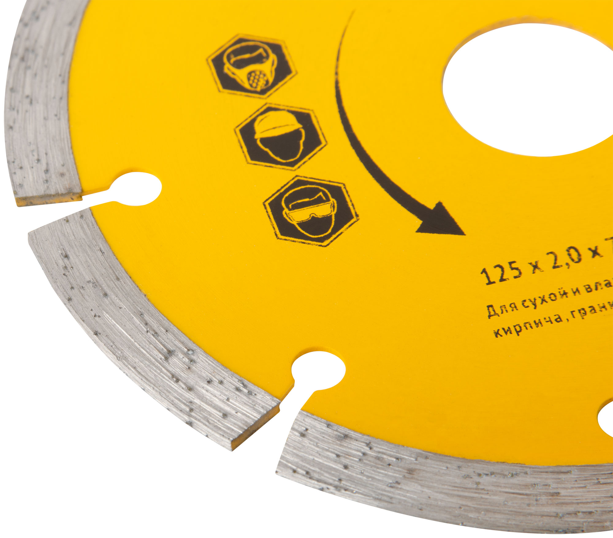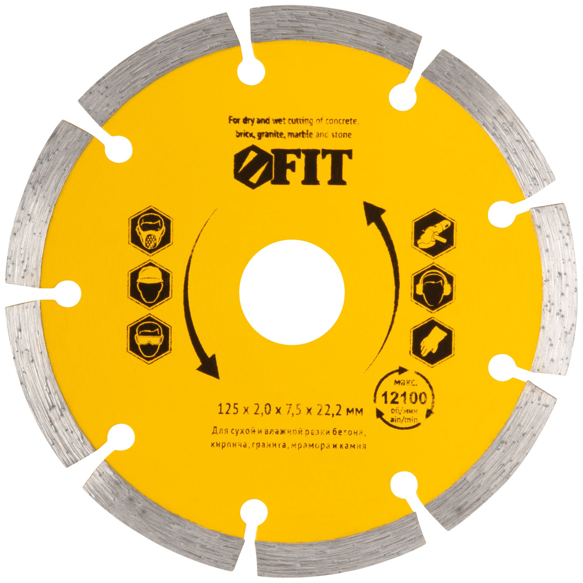 Сегментный, для сухой и влажной резки. Применяется для резки бетона, кирпича, гранита, мрамора и камня. Высота алмазной режущей кромки 7,5 мм. Посадочный диаметр 22,2 мм. Материал: высококачественная инструментальная сталь, режущая кромка содержит порошок из технических алмазов. Упаковка: 37463-37464 блистер, 37467 картонный конверт.