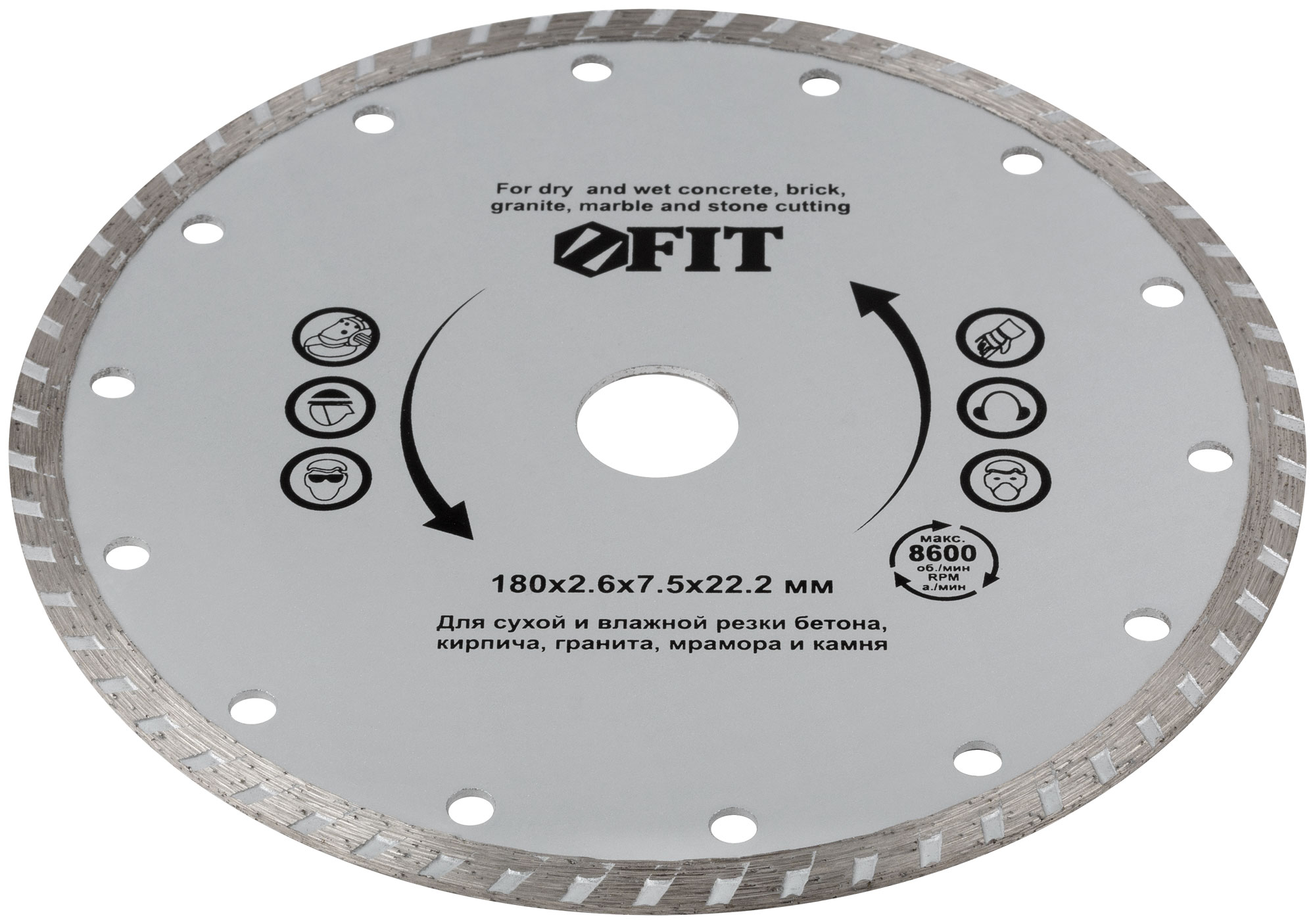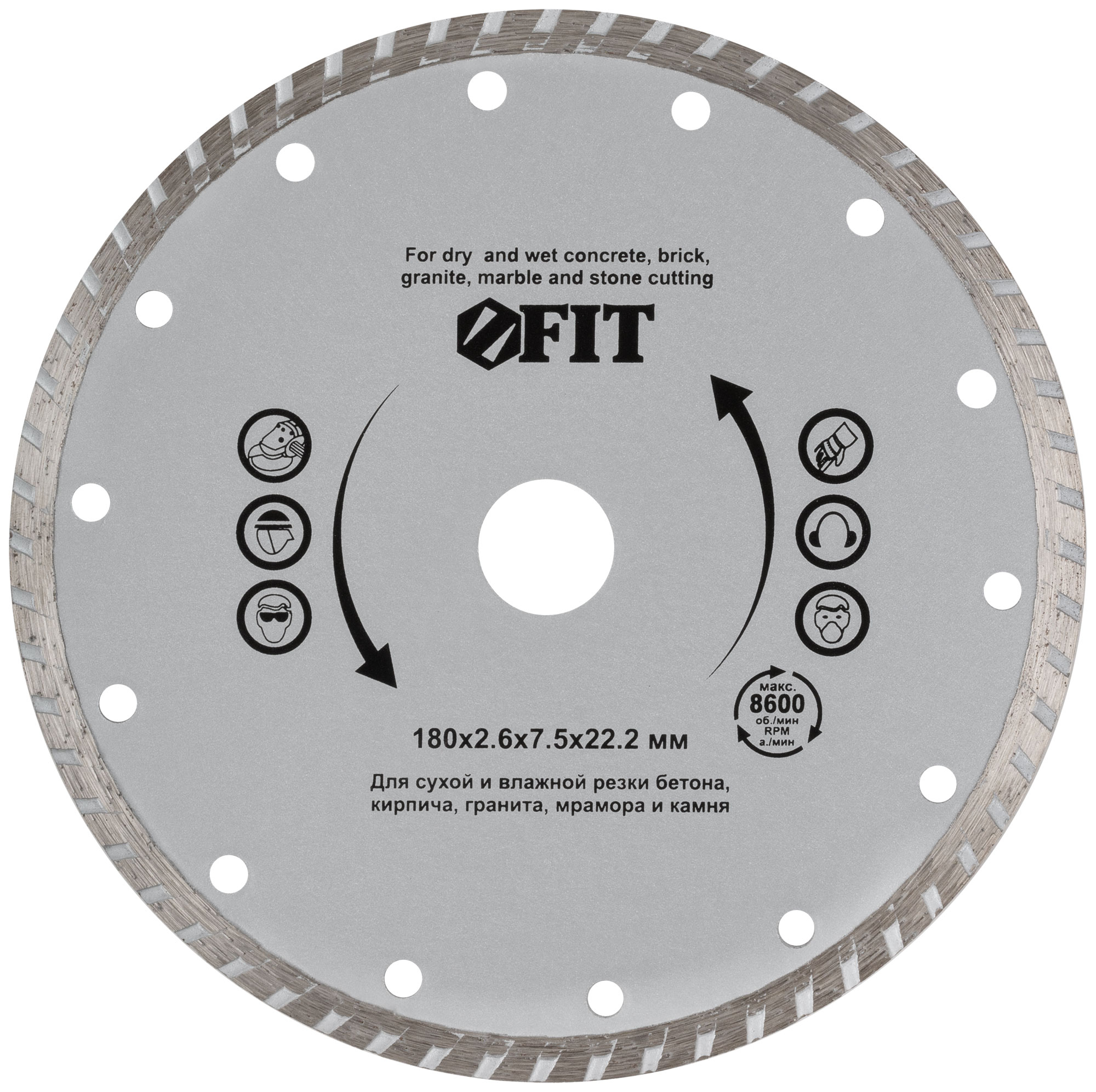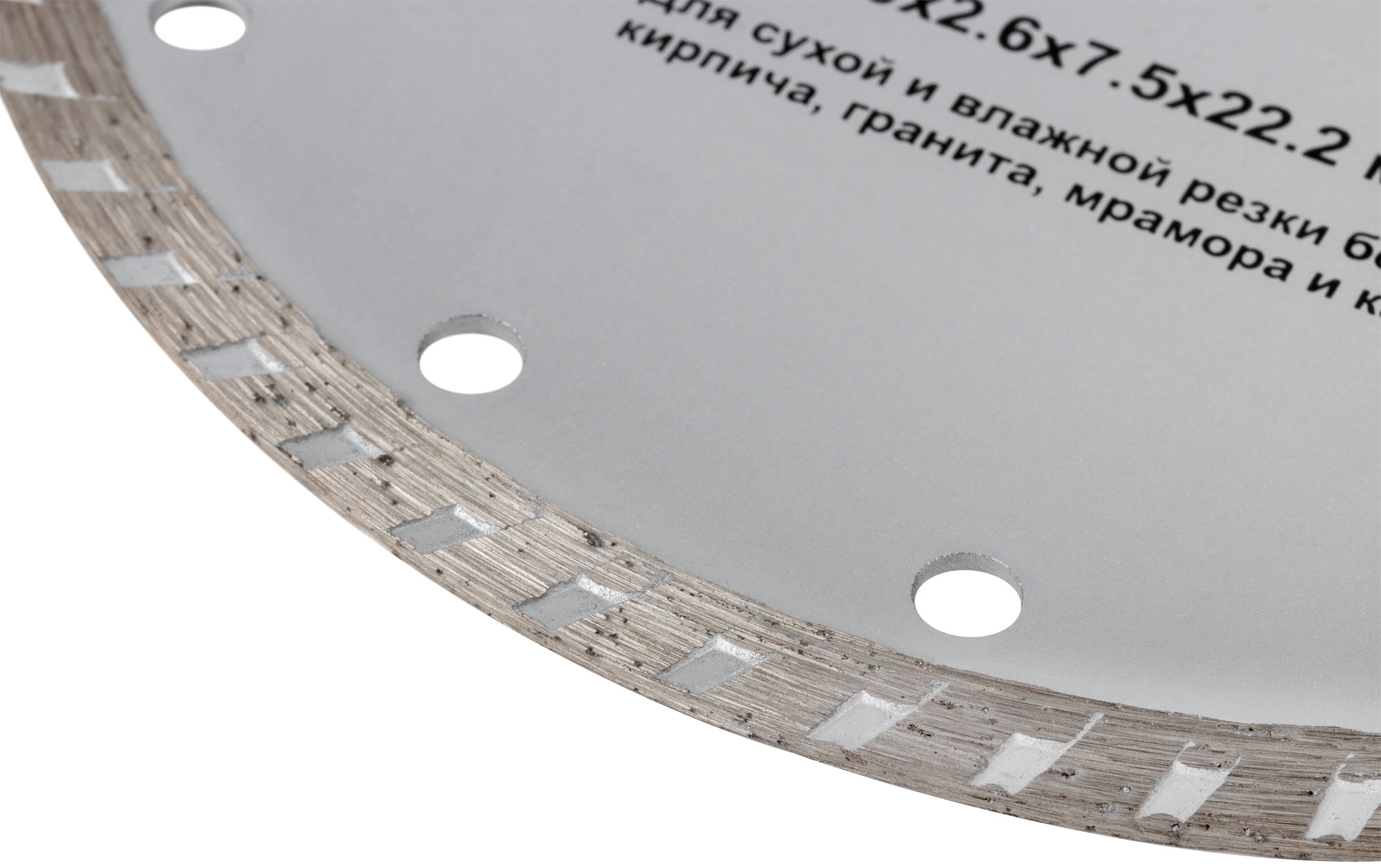 «Турбо». Для сухой и влажной резки. Универсальный. Применяется для резки бетона, кирпича, гранита, мрамора и камня. Высота алмазной режущей кромки 7,5 мм. Посадочный диаметр 22,2 мм. Материал: высококачественная инструментальная сталь, режущая кромка содержит порошок из технических алмазов. Упаковка: картонный конверт.
