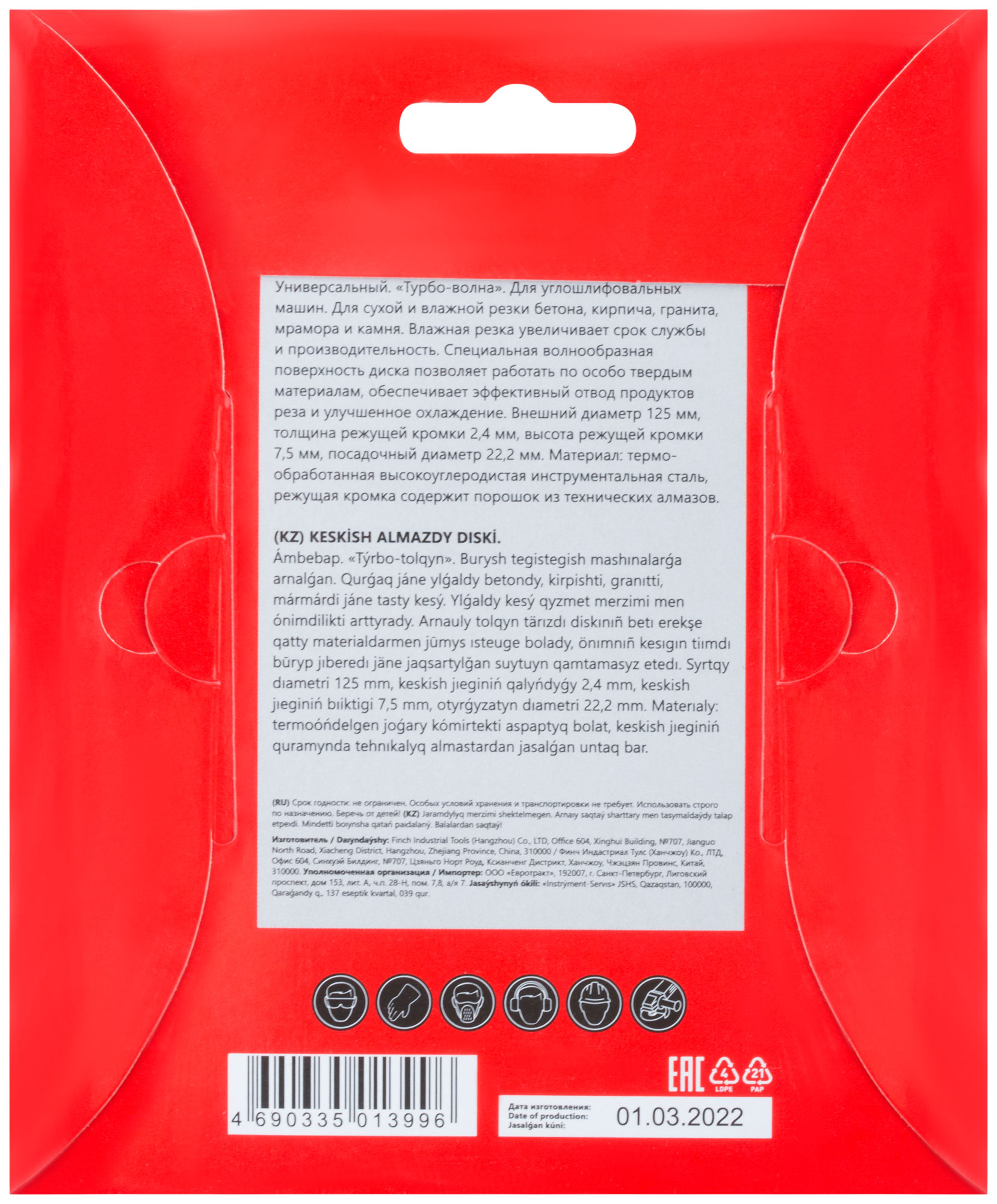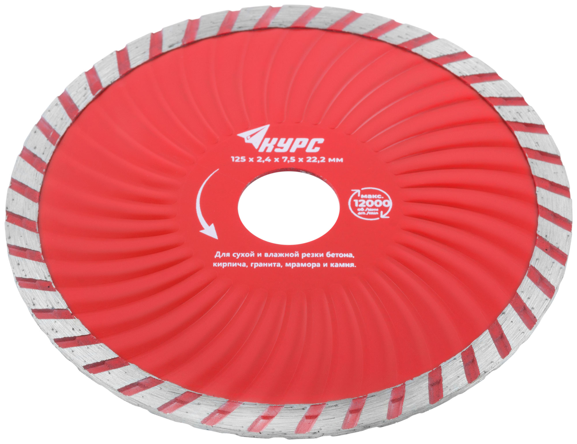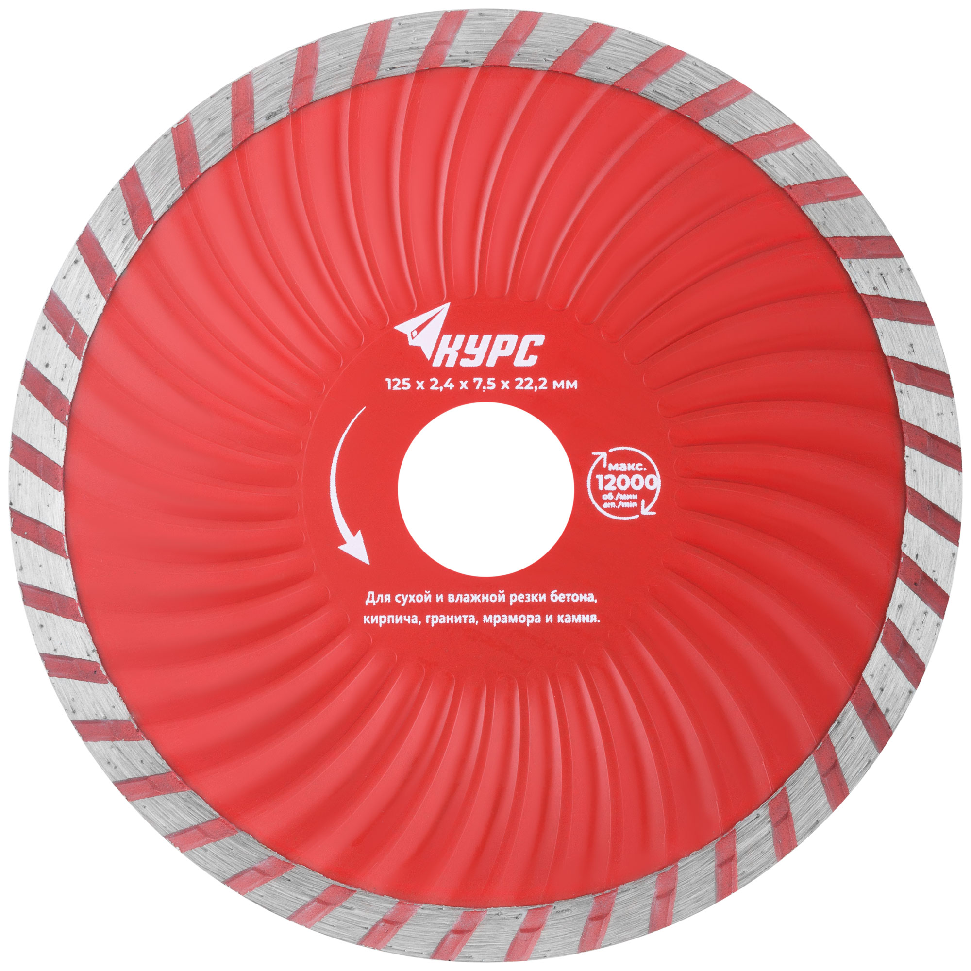 «Турбо-волна». Универсальный. Для сухой и влажной резки бетона, кирпича, гранита, мрамора и камня. Усиленная конструкция. Высота алмазной режущей кромки 7 мм. Посадочный диаметр 22,2 мм. Материал: инструментальная сталь, режущая кромка содержит порошок из технических алмазов. Упаковка: картонный конверт.