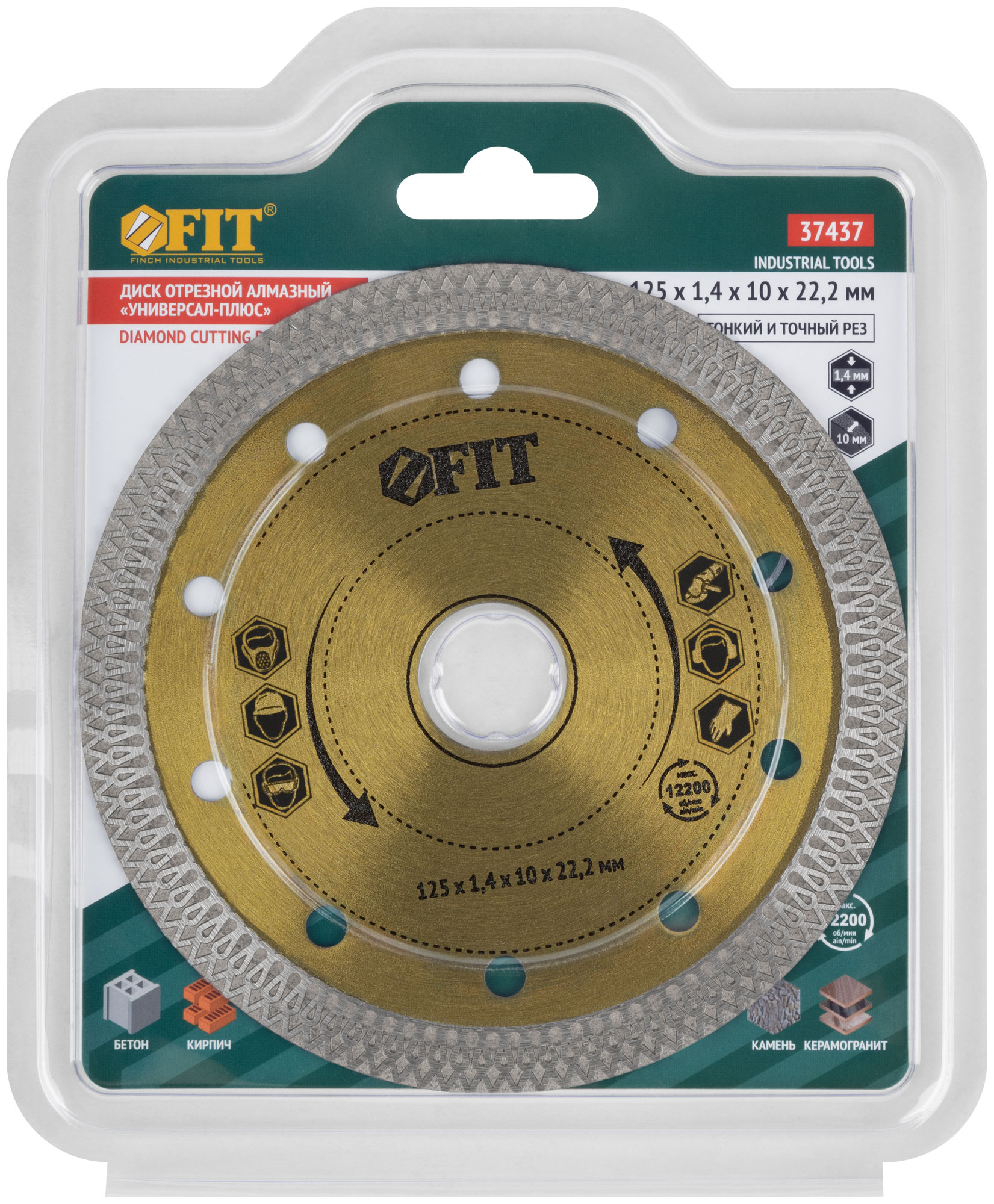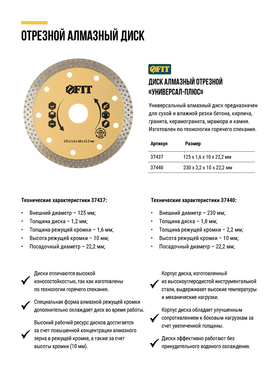 «Универсал-плюс». Универсальный. Для сухой и влажной резки бетона, кирпича, гранита, керамогранита, мрамора и камня. Изготовлен по технологии горячего спекания. Высота алмазной режущей кромки 10 мм. Посадочный диаметр 22,2 мм. Предназначен для углошлифовальных машин.Материал: высокоуглеродистая инструментальная сталь, режущая кромка содержит порошок из технических алмазов. Упаковка: картонный конверт.