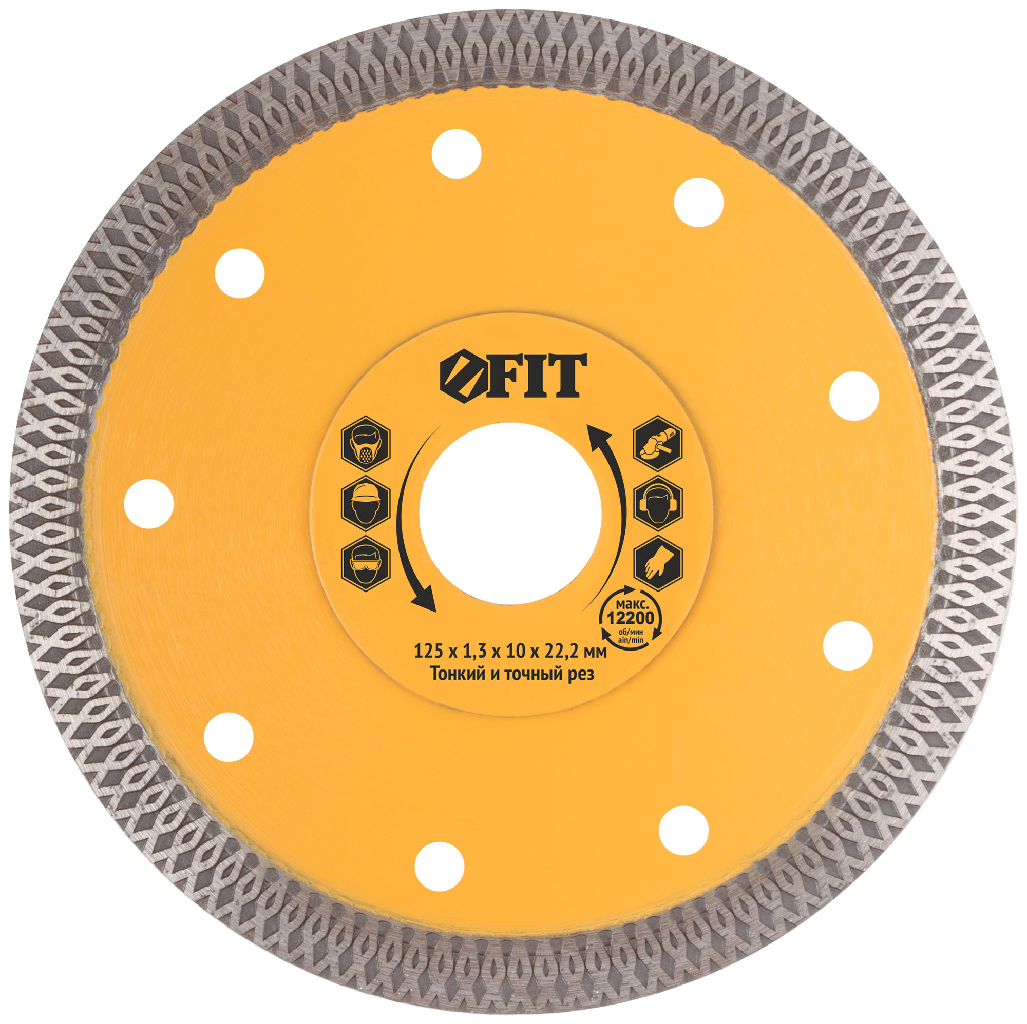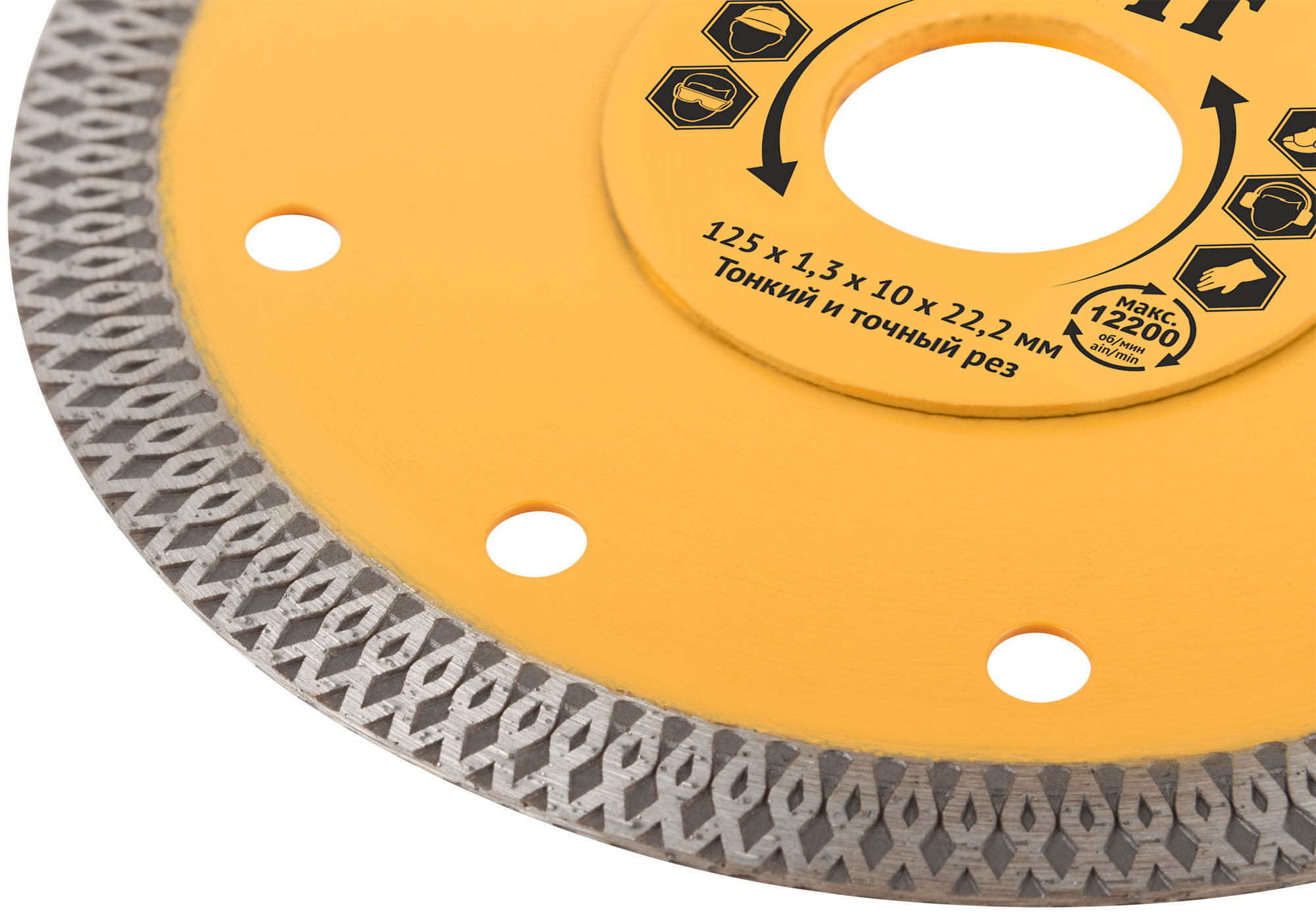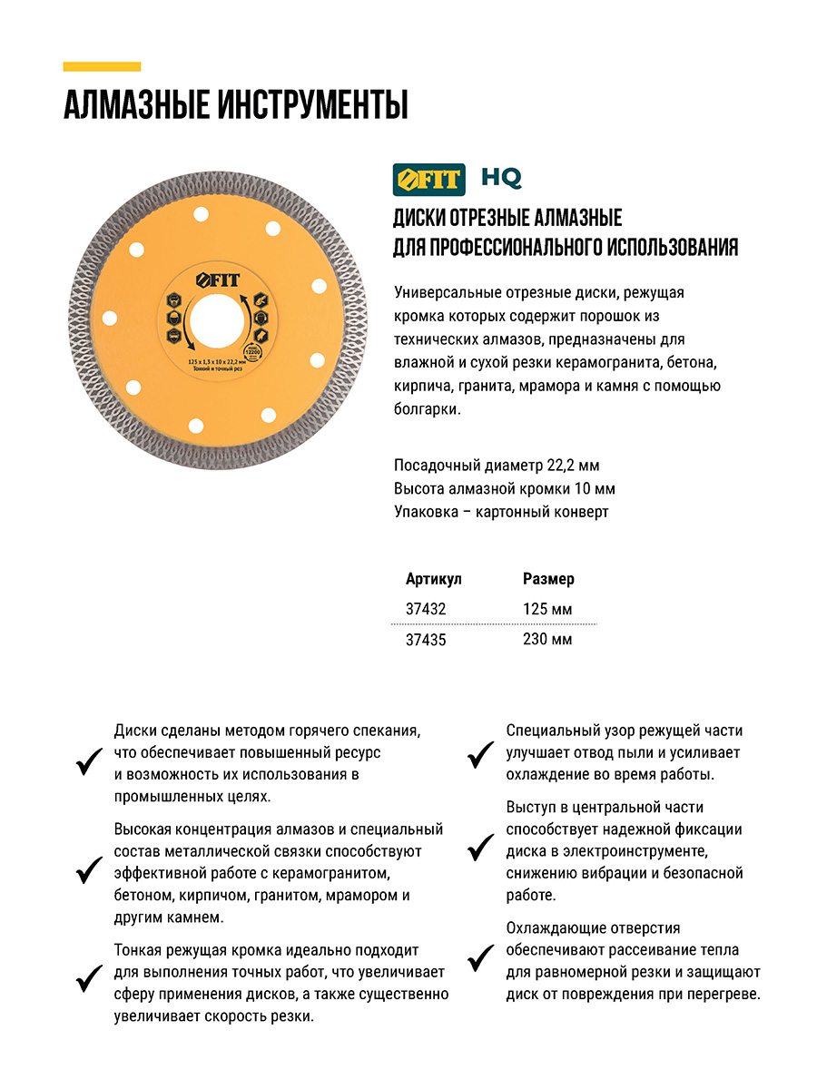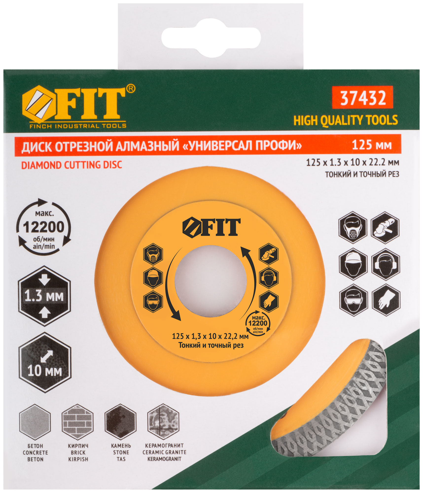 Универсальный, усиленный. Тонкий рез. Изготовлен по технологии горячего спекания. Для влажной и сухой резки керамогранита, бетона, кирпича, гранита, мрамора и камня. Посадочный диаметр 22,2 мм. Высота алмазной кромки 10 мм. Материал: инструментальная сталь, режущая кромка содержит порошок из технических алмазов. Упаковка: 37432 блистер;37433-37435 картонный конверт.