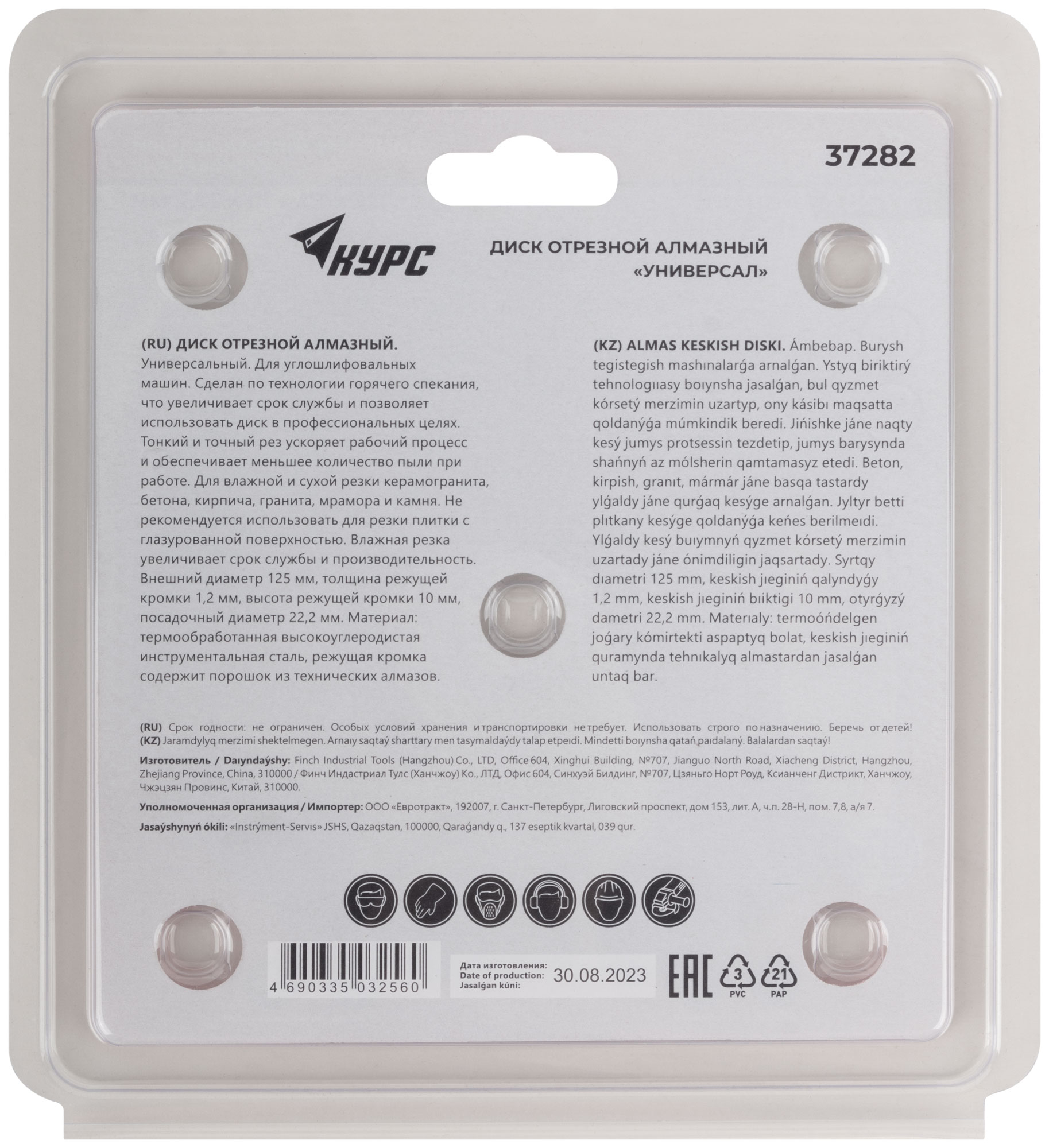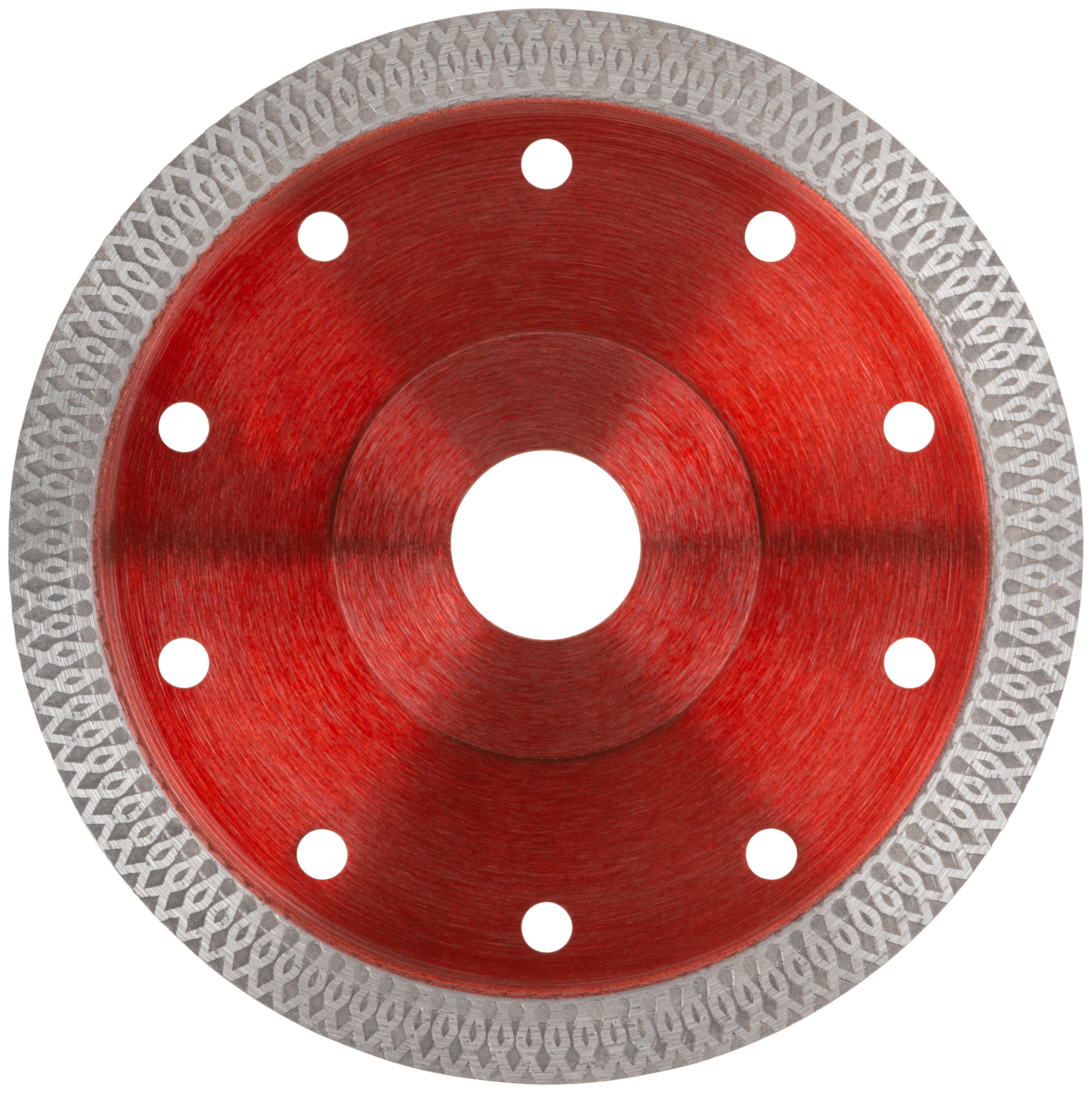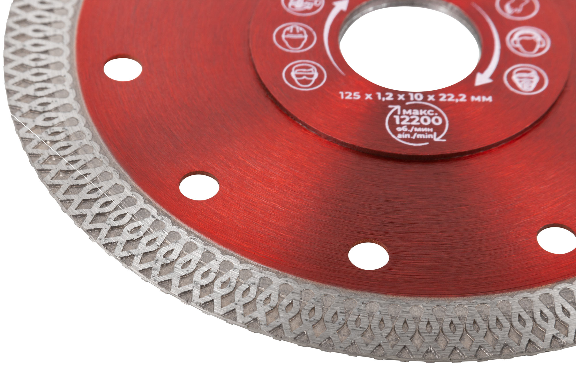 Универсальный, усиленный. Тонкий рез. Изготовлен по технологии горячего спекания. Для влажной и сухой резки керамогранита, бетона, камня, кирпича, мрамора и камня. Высота алмазной режущей кромки 10 мм. Посадочный диаметр 22,2 мм. Материал: инструментальная сталь, режущая кромка содержит порошок из технических алмазов. Упаковка: 37282 блистер; 37285 картонный конверт.