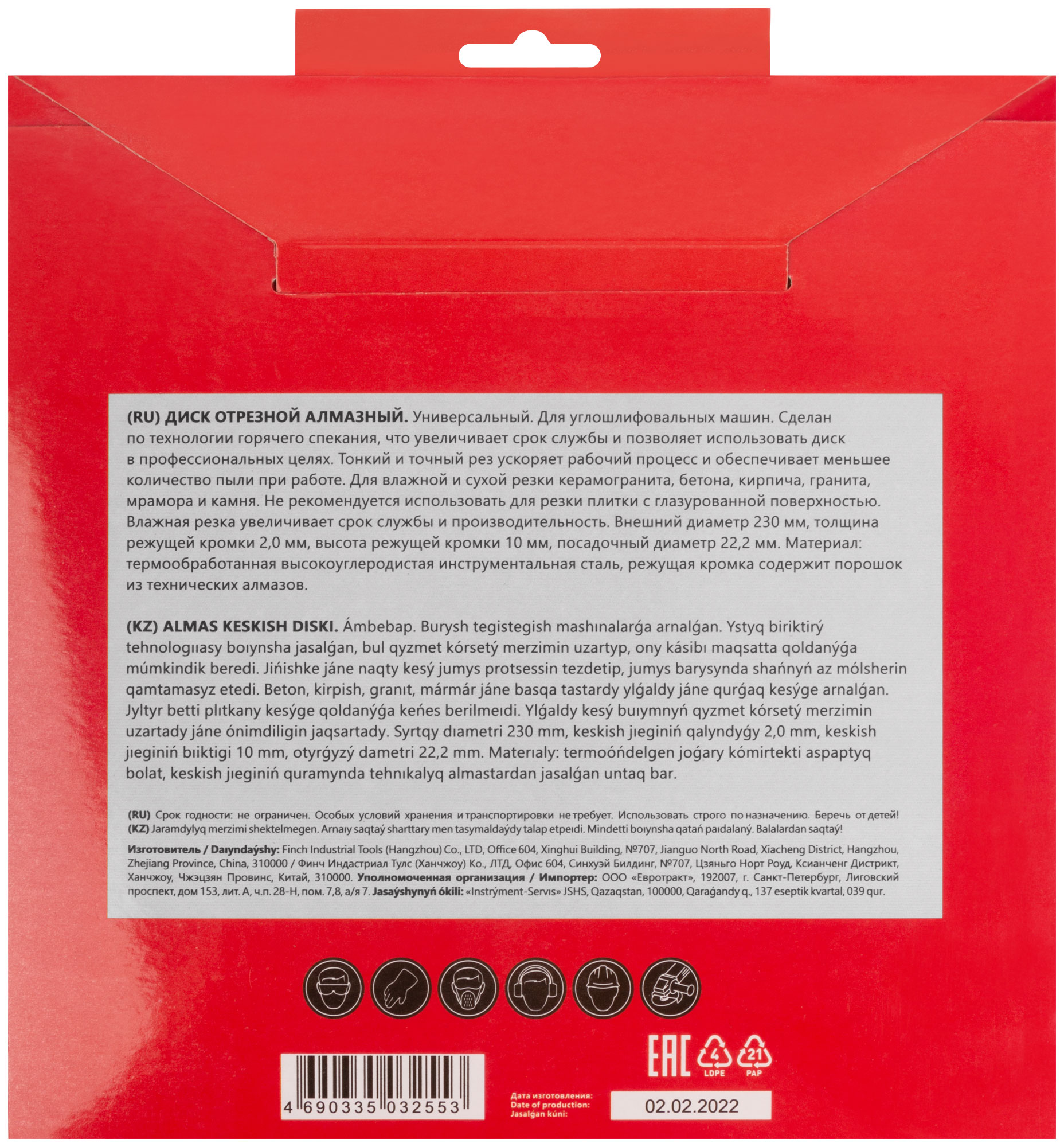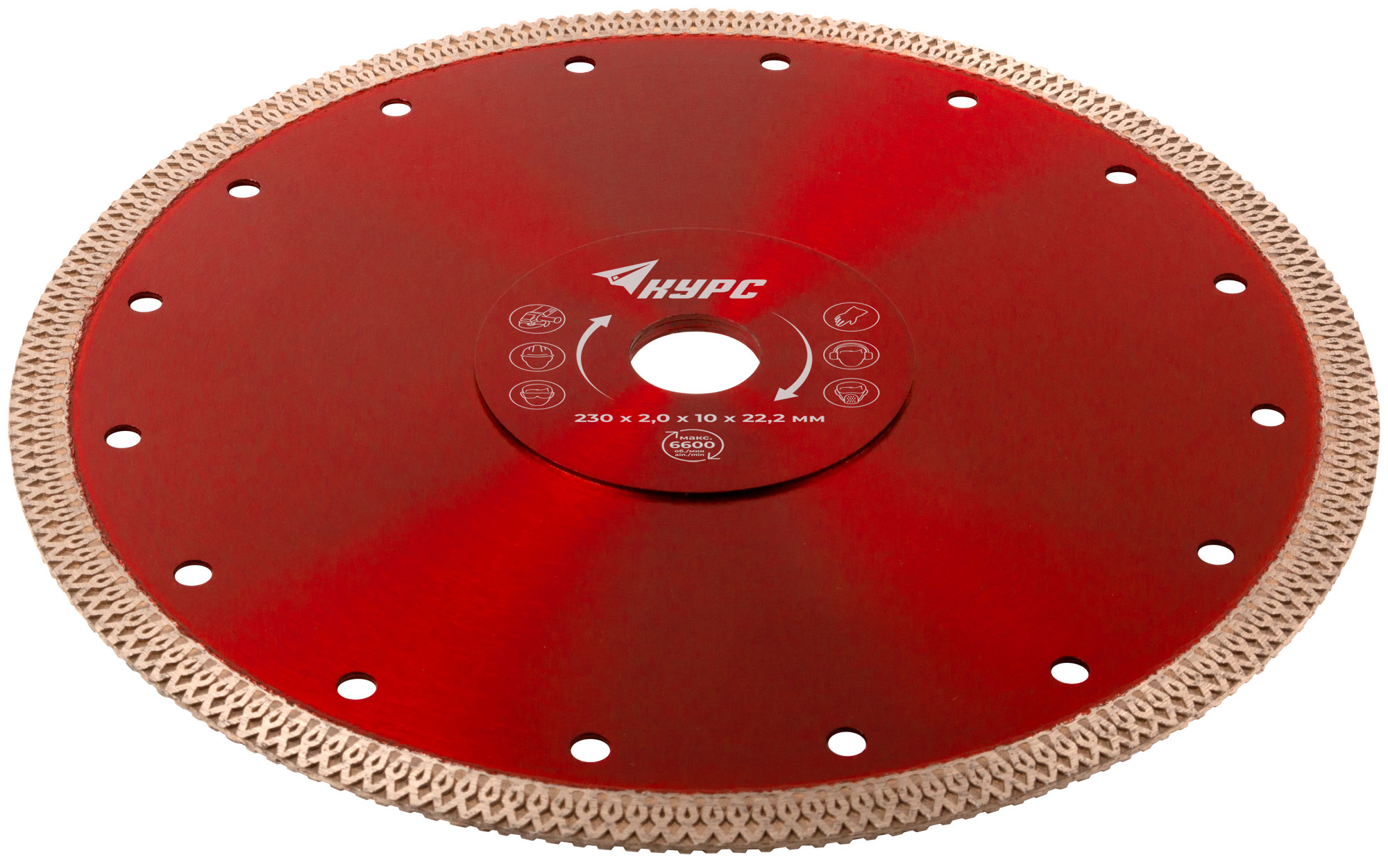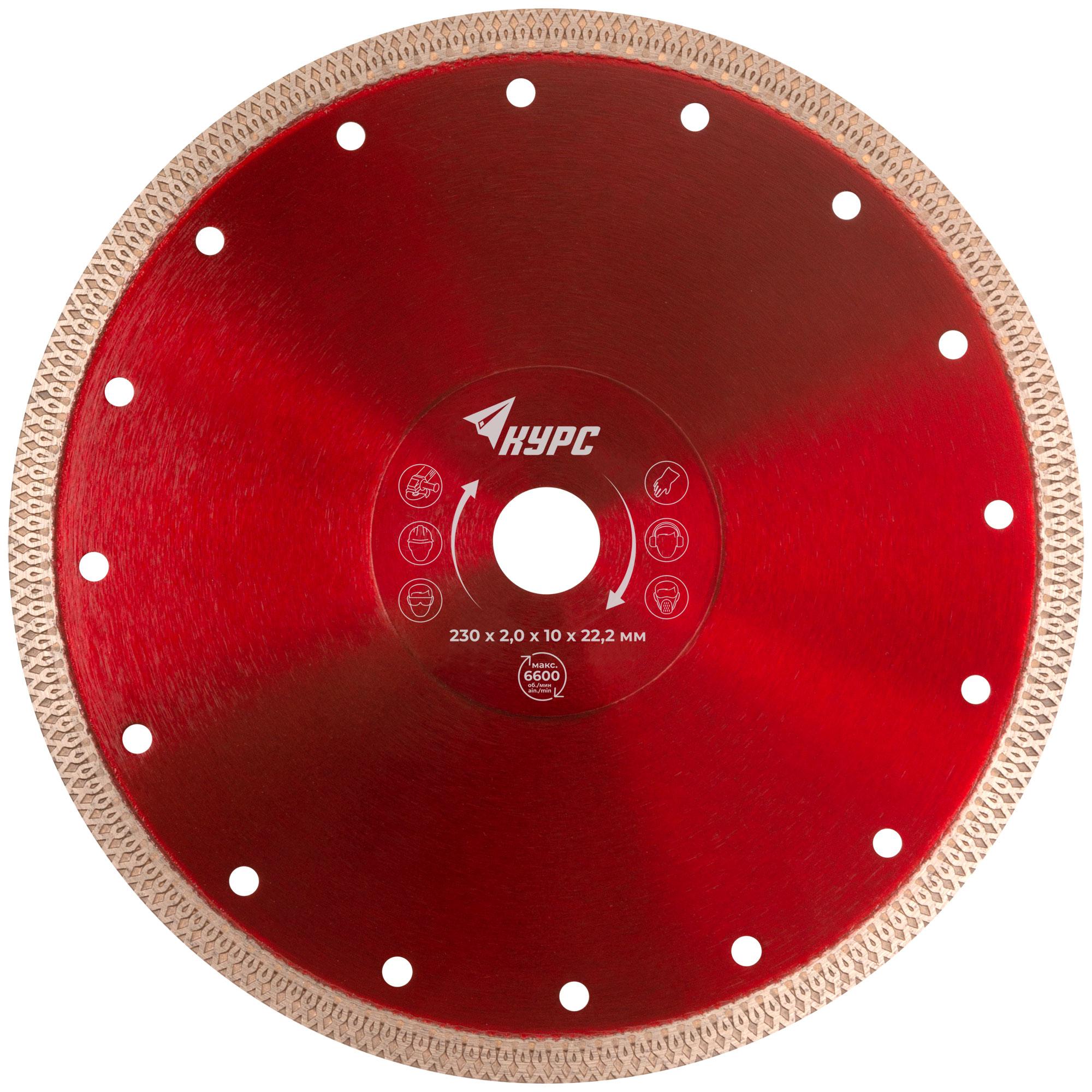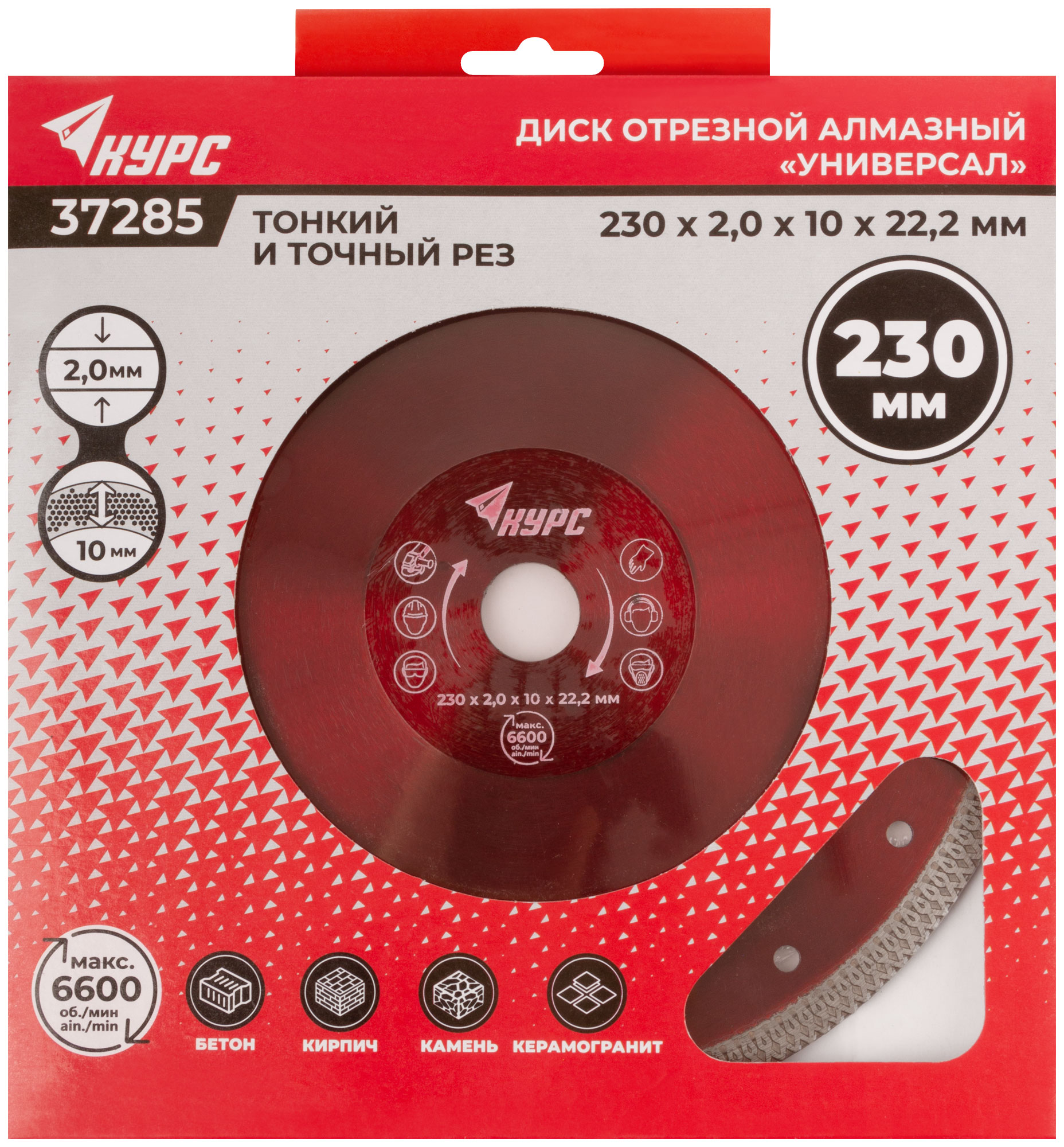 Универсальный, усиленный. Тонкий рез. Изготовлен по технологии горячего спекания. Для влажной и сухой резки керамогранита, бетона, камня, кирпича, мрамора и камня. Высота алмазной режущей кромки 10 мм. Посадочный диаметр 22,2 мм. Материал: инструментальная сталь, режущая кромка содержит порошок из технических алмазов. Упаковка: 37282 блистер; 37285 картонный конверт.