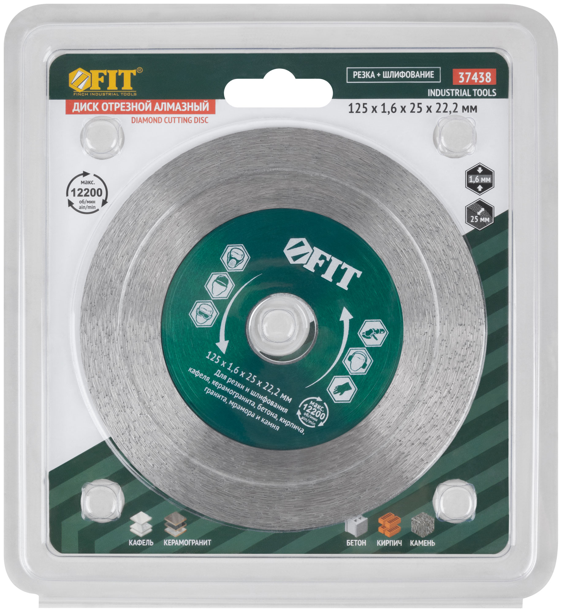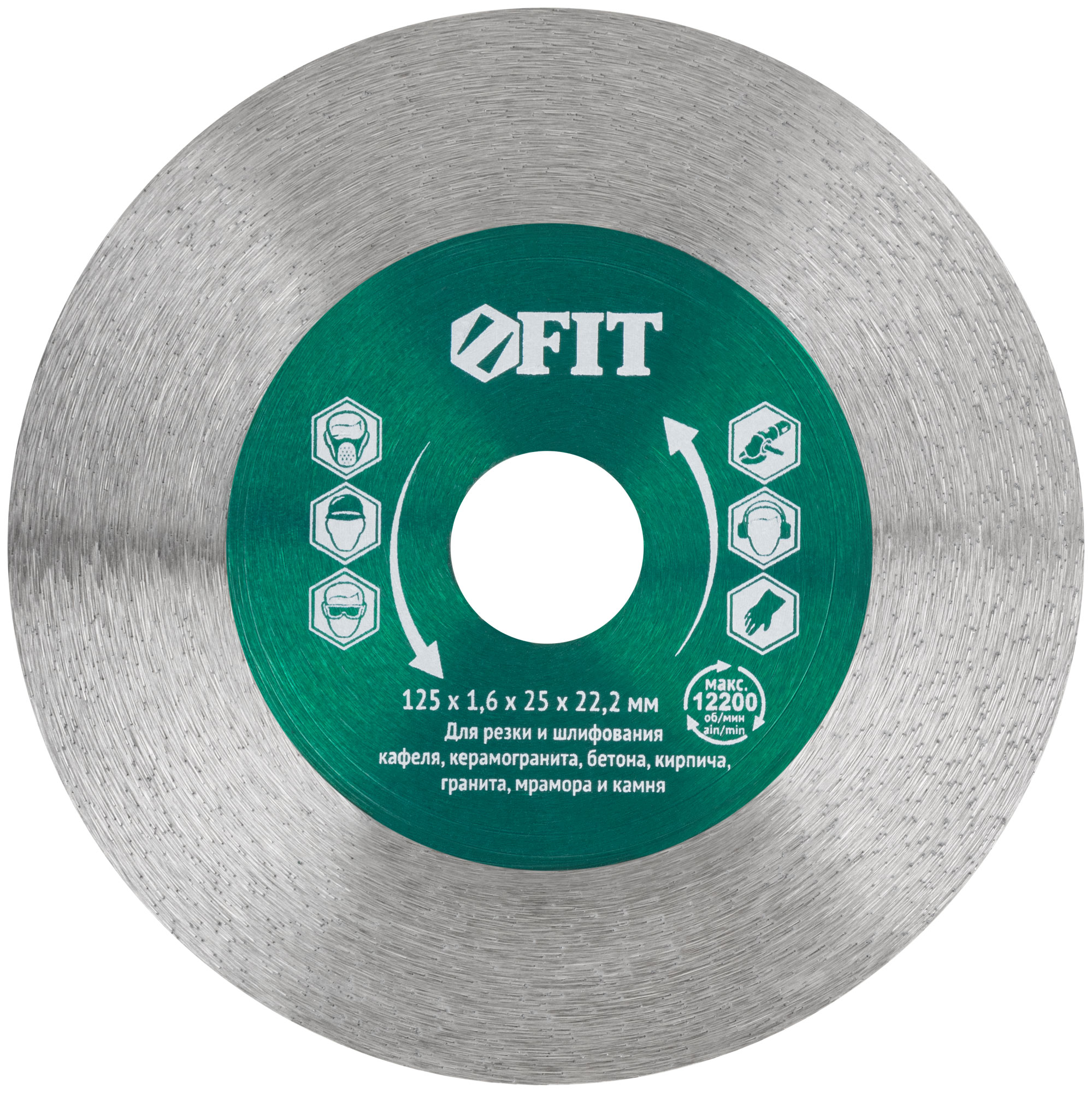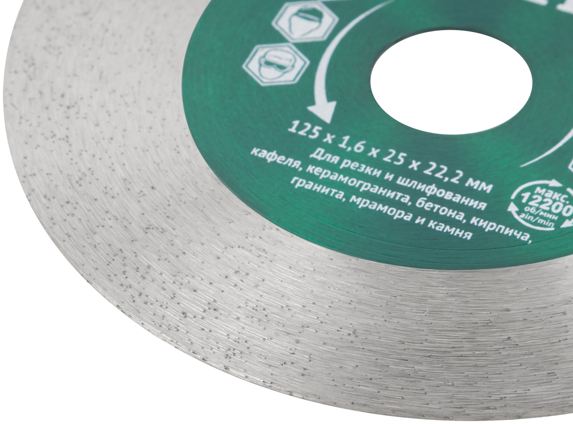 Сплошной. Для сухой и влажной резки и шлифования кафеля, керамогранита, бетона, кирпича, гранита, мрамора и камня. Изготовлен по технологии горячего спекания. Высота режущей кромки 25 мм. Предназначен для углошлифовальных машин. Посадочный диаметр 22,2 мм. Материал: инструментальная сталь, режущая кромка содержит порошок из технических алмазов. Упаковка: блистер.