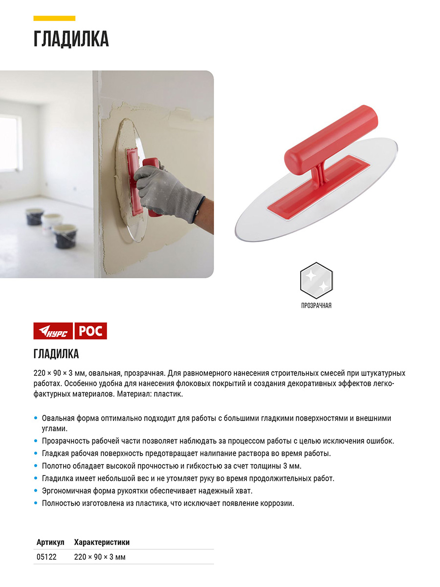 Гладилка пластиковая 220х90х3 мм, прозрачная овальная