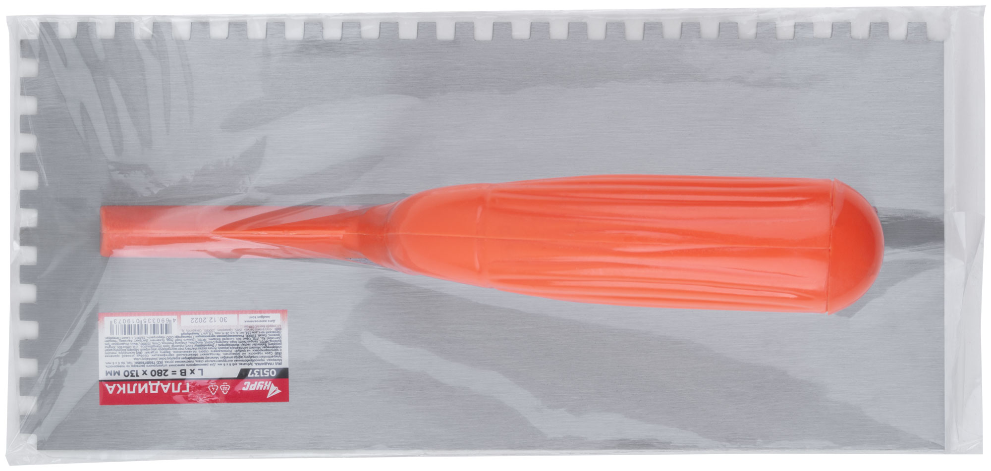 Гладилка стальная с пластиковой ручкой, 280х130 мм зубчатая, зуб 6х6 мм