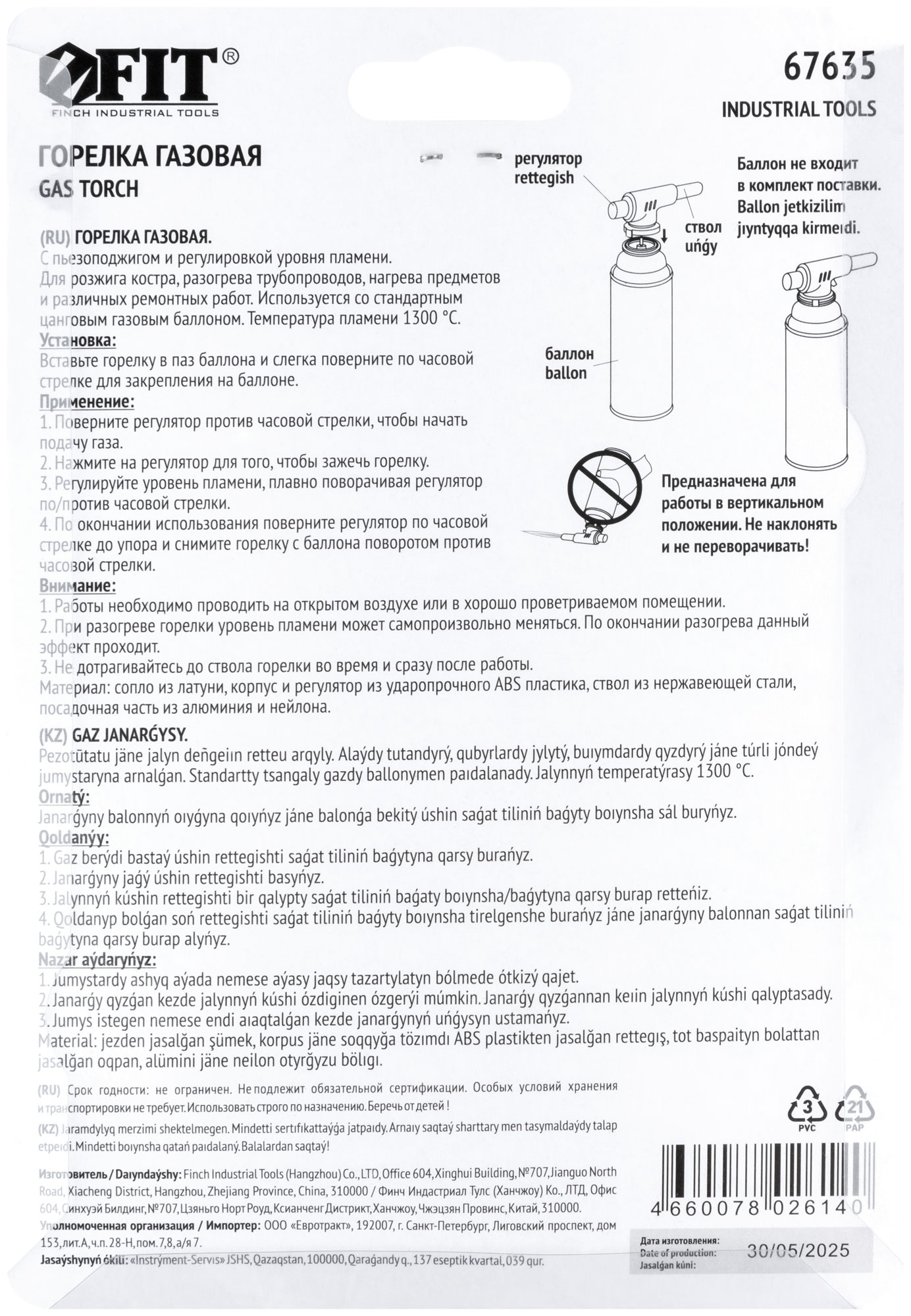 С пьезоподжигом. Для розжига костра, разогрева трубопровода, нагрева предметов и различных ремонтных работ. Регулировка уровня пламени. Используется со стандартным цанговым газовым баллоном. Материал: инструментальная сталь, термостойкий пластик. Упаковка: блистер.
