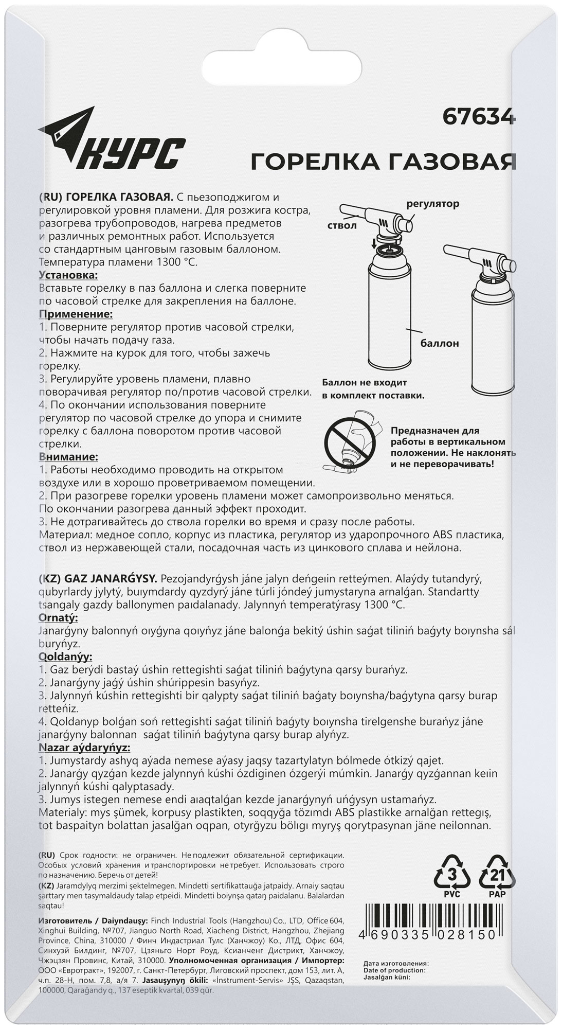 С пьезоподжигом. Для розжига. костра, нагрева предметов и различных ремонтных работ. С регулятором уровня пламени. Используется со стандартным цанговым газовым баллоном. Материал: медь, алюминий, цинковый сплав, нержавеющая сталь, термостойкий пластик. Упаковка : блистер.