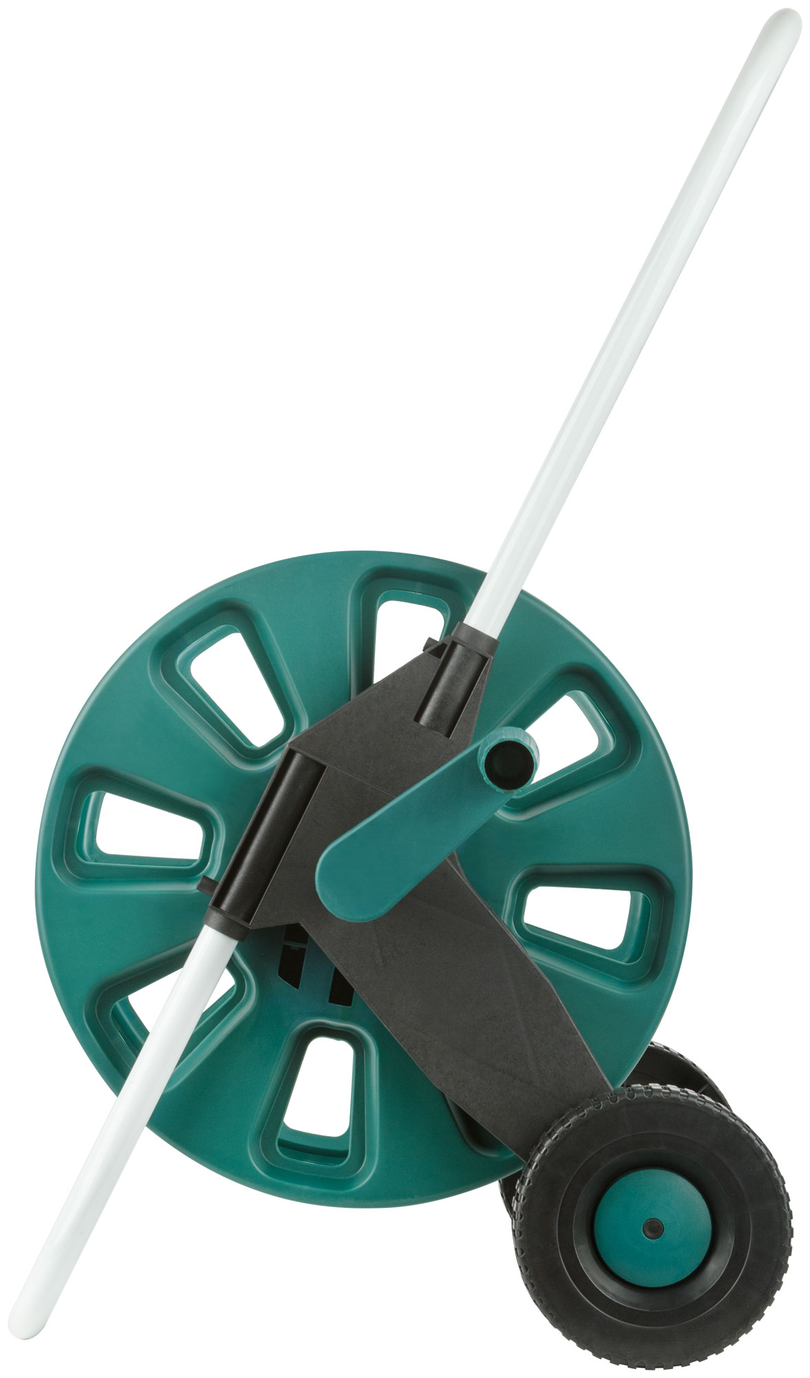 Большая, на колесах. Для шланга 1/2". Материал: пластиковый корпус, металлический каркас. Упаковка: картонная коробка.