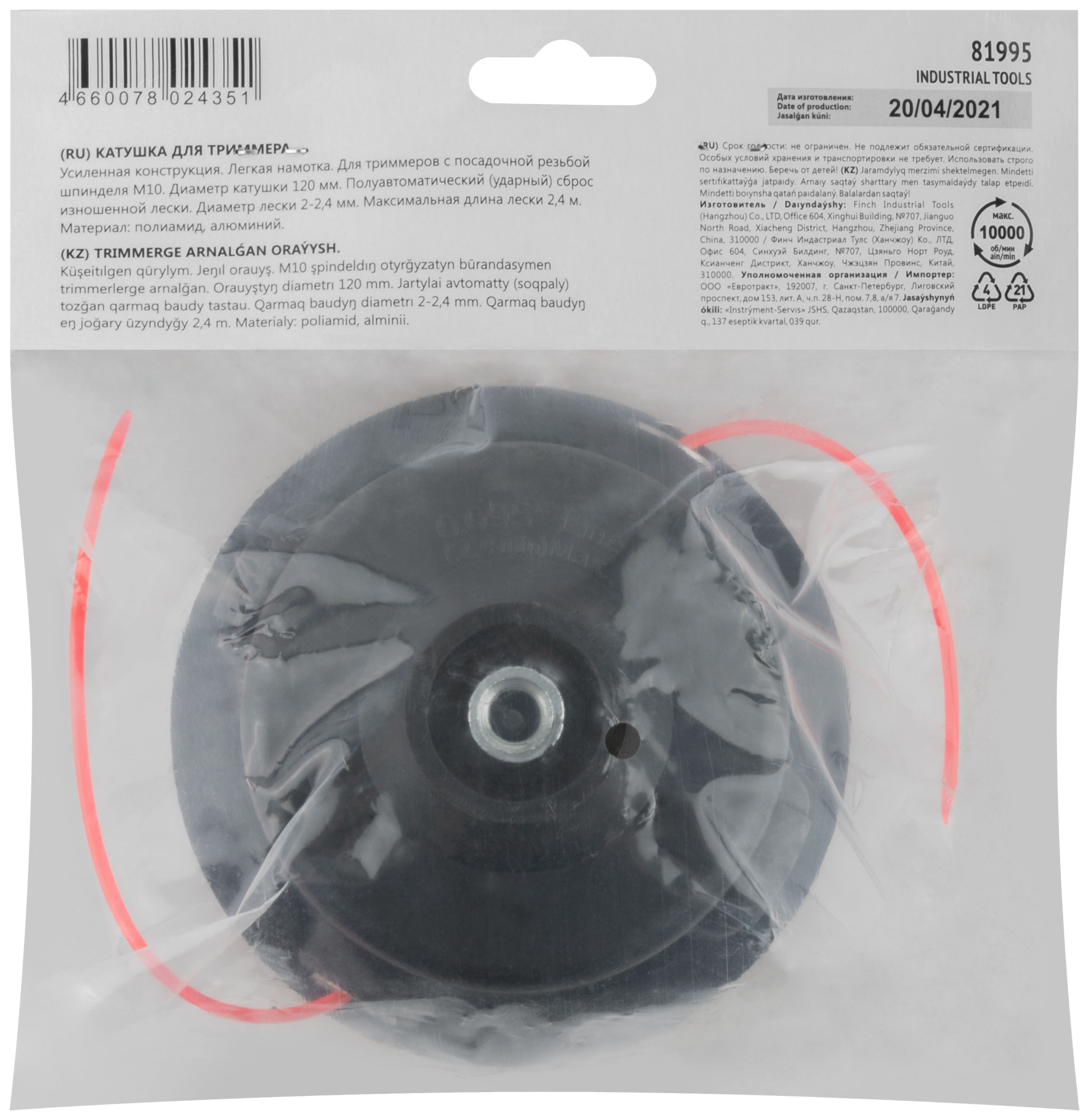 Катушка для триммера универсальная М10, полуавтоматическая, усиленная, 10000 об/мин; леска 2,0-2,4 мм