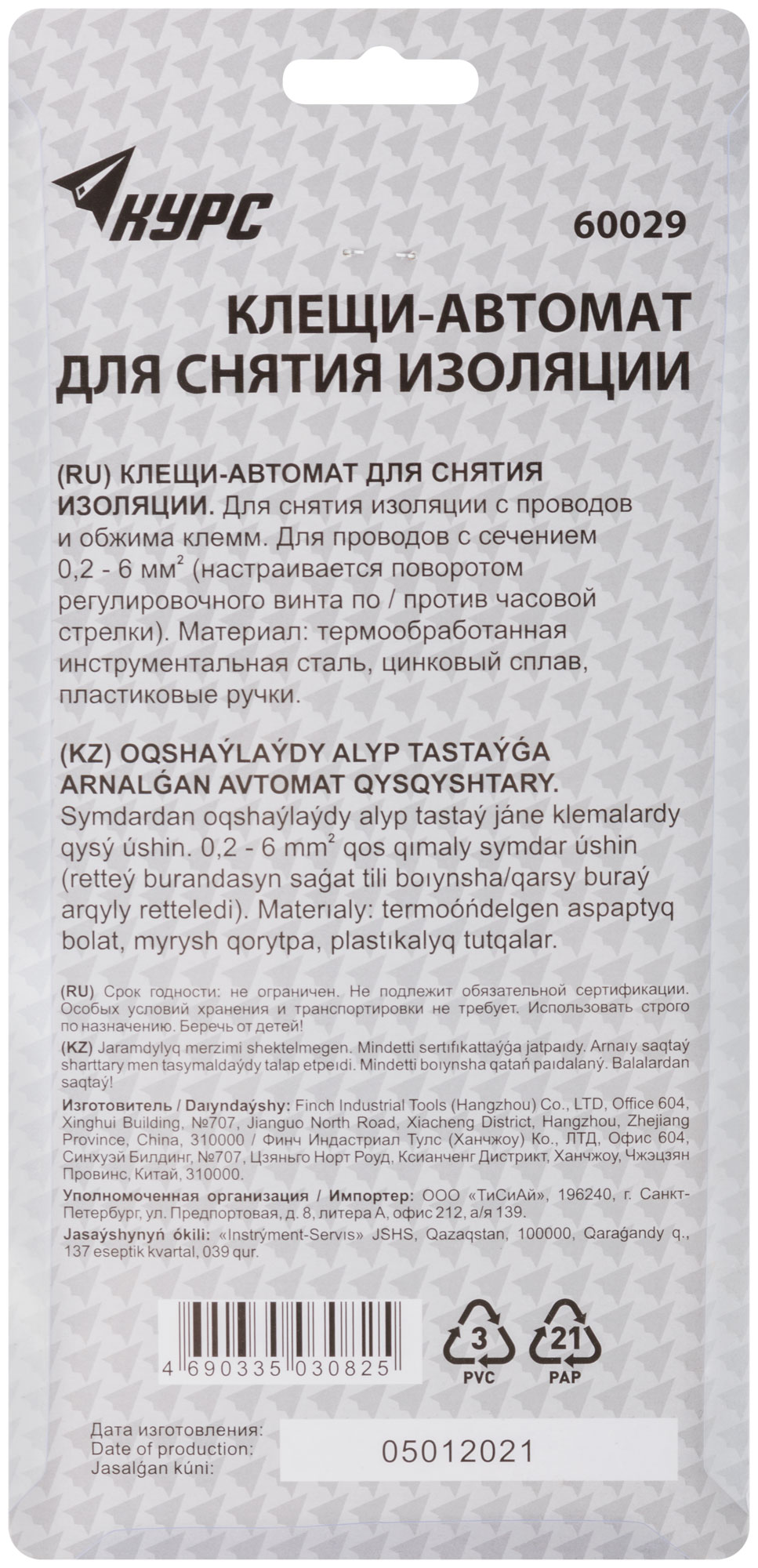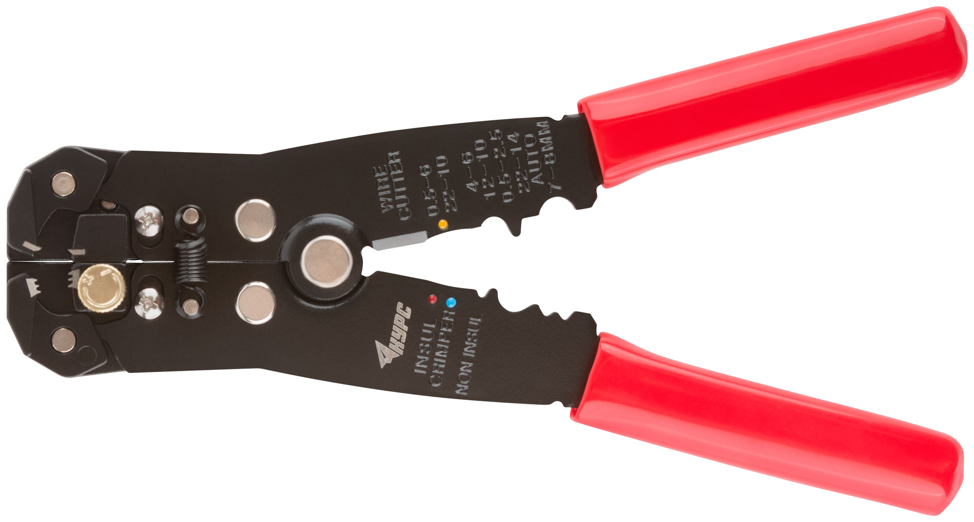 Регулируемый диаметр. Для снятия изоляции с проводов и обжима клемм. Для проводов с сечением 0,2 - 6,0 мм2. Материал: инструментальная сталь, цинковый сплав, пластиковые ручки. Упаковка: блистер.