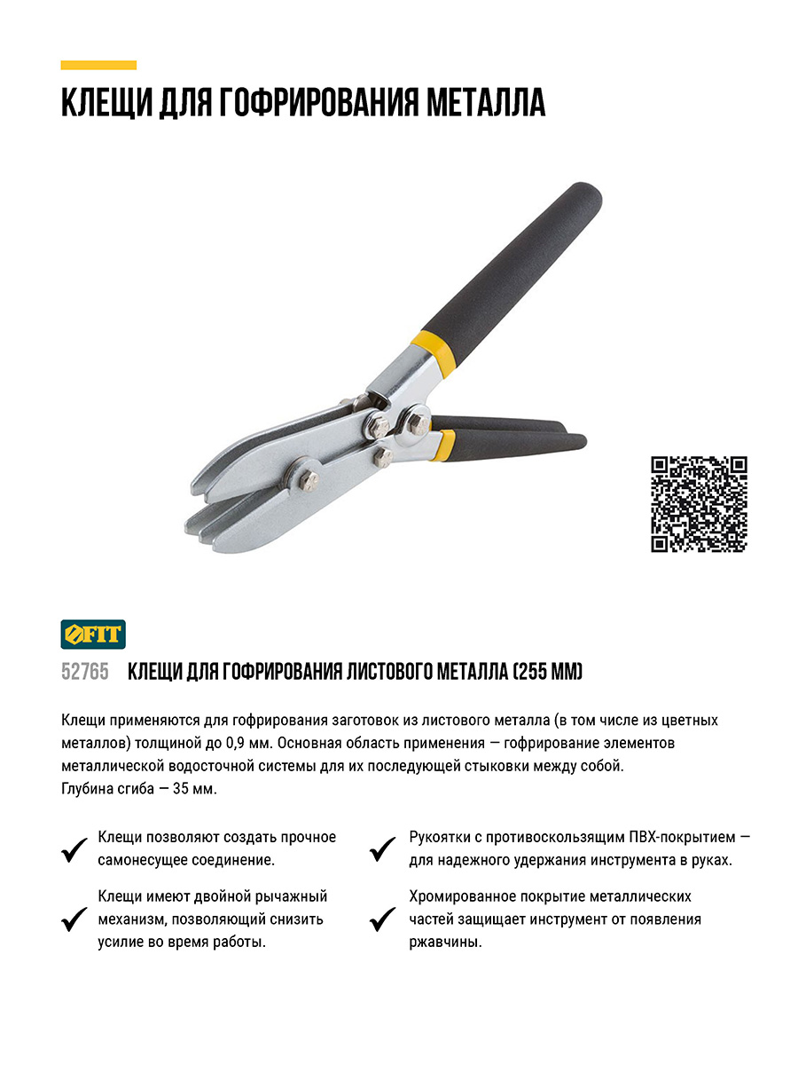 Применяются для гофрирования заготовок из листового металла (в том числе из цветных металлов) толщиной до 0,9 мм. Основная областьприменения - гофрирование элементов металлической водосточной системы для их последующей стыковки между собой. Глубина сгиба - 35 мм.Материал: инструментальная сталь, ПВХ покрытие ручек. Упаковка: блистер.