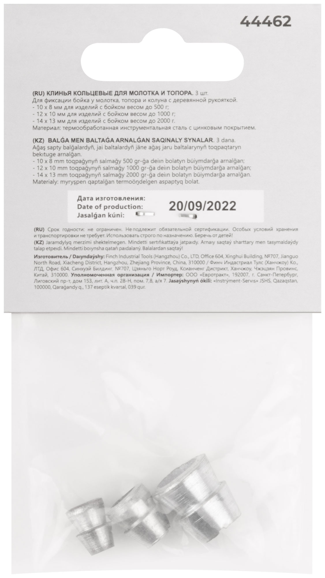 3 шт. Для фиксации молотков и топоров с деревянными рукоятками. Материал: инструментальная сталь, цинковое покрытие. Упаковка: П/Э пакет с картонным подвесом.