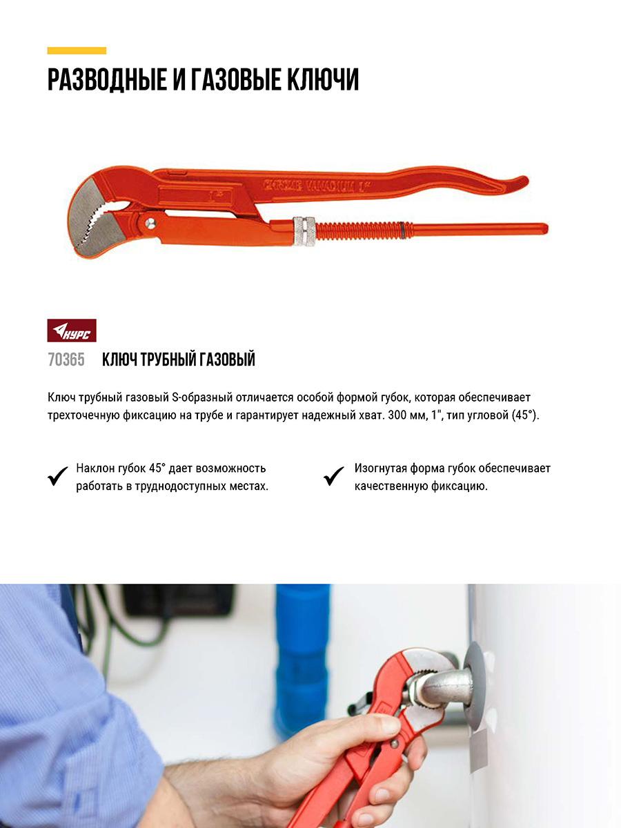 Тип угловой (45º), S-образный. Цельнокованый, шлифованные губки. Форма губок обеспечивает трехточечную фиксацию на трубе и гарантирует надежный хват. Материал: инструментальная сталь.