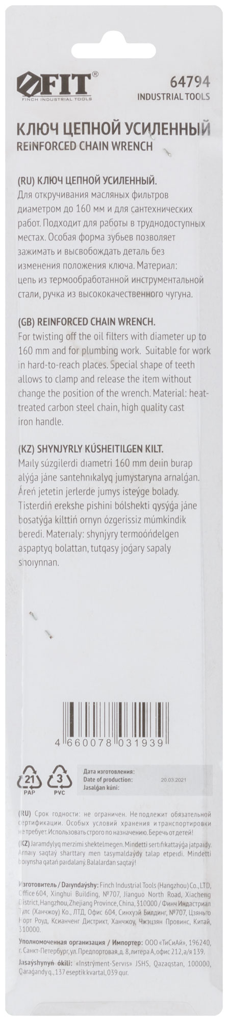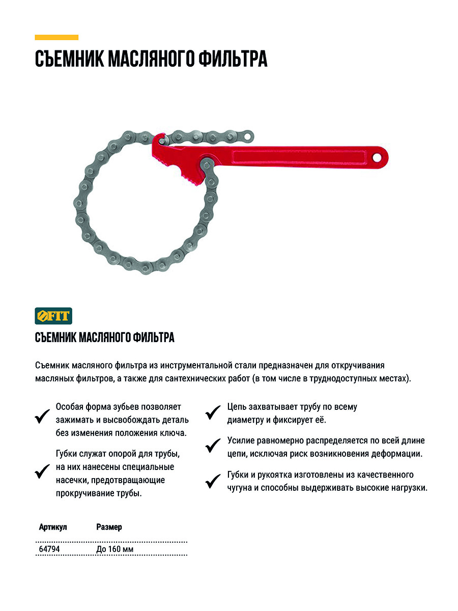 Для откручивания масляных фильтров и для сантехнических работ, в том числе в труднодоступных местах. Особая форма зубьев позволяет зажимать и высвобождать деталь без изменения положения ключа. Материал: цепь из инструментальной стали, ручка из высококачественного чугуна. Упаковка: блистер.