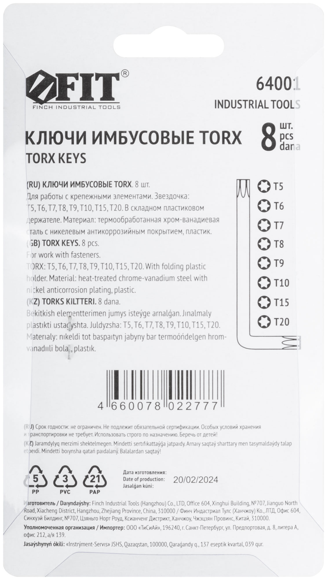 Набор в складном пластиковом держателе 8 шт. Материал: термообработанная хром-ванадиевая сталь. Упаковка: блистер.