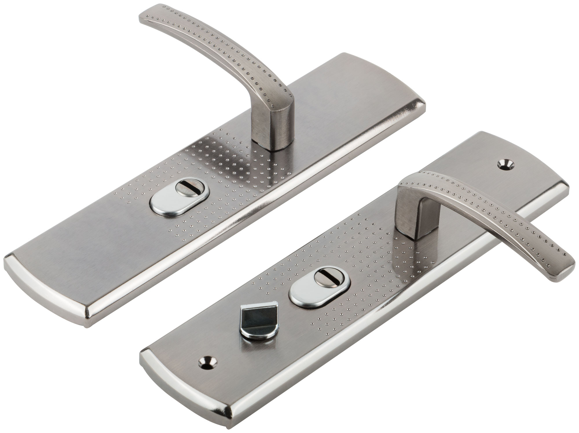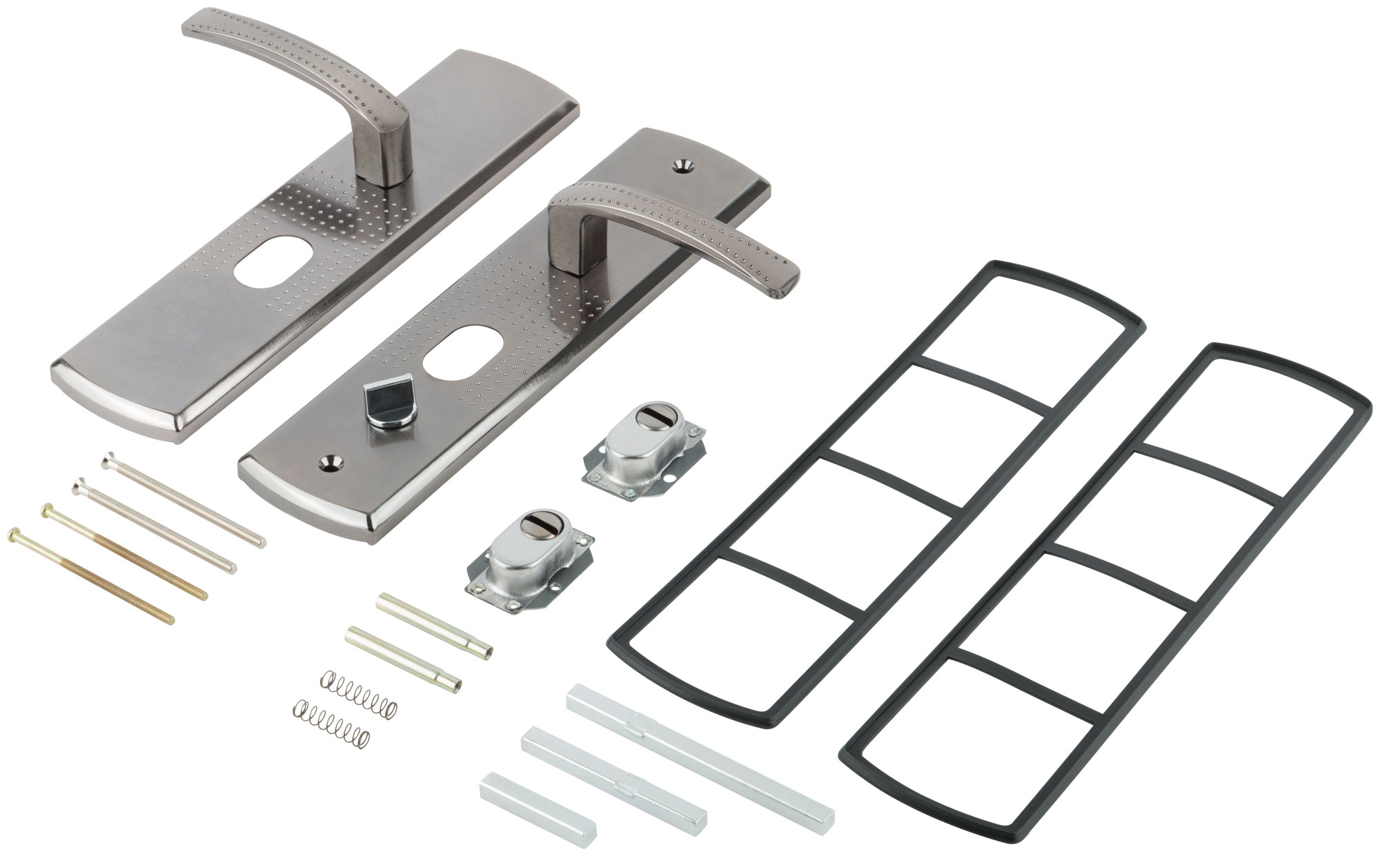 Подходят для замков автоматического и не автоматического закрывания. Межосевое расстояние -68мм, размеры планки-60х275мм, длина/высота руски 120/45 мм соответственно. цвет ручек и планки -никель/хром. В комплекте: 2 ручки, винтовые стяжки, пластиковые прокладки под ручки, квадрат (8х8мм) 110мм, комплекты стержней для автоматических замков. Материал: сталь 1,1 мм, гальваническое покрытие. Упаковка: картонная коробка.