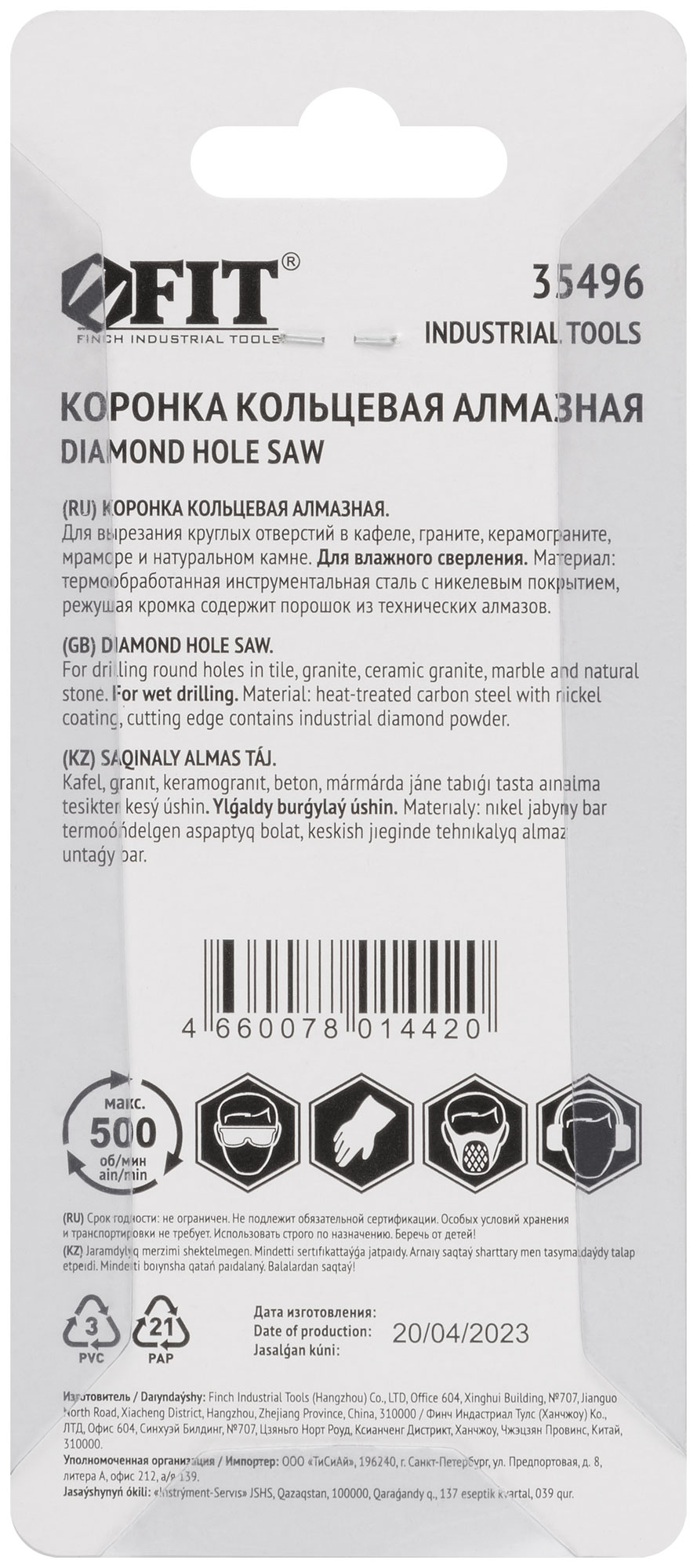 Для вырезания круговых отверстий в керамограните, мраморе, натуральном камне, граните, кафеле. Влажное сверление. Материал: инструментальная сталь с никелевым покрытием, режущая кромка содержит порошок из технических алмазов. Упаковка: блистер.