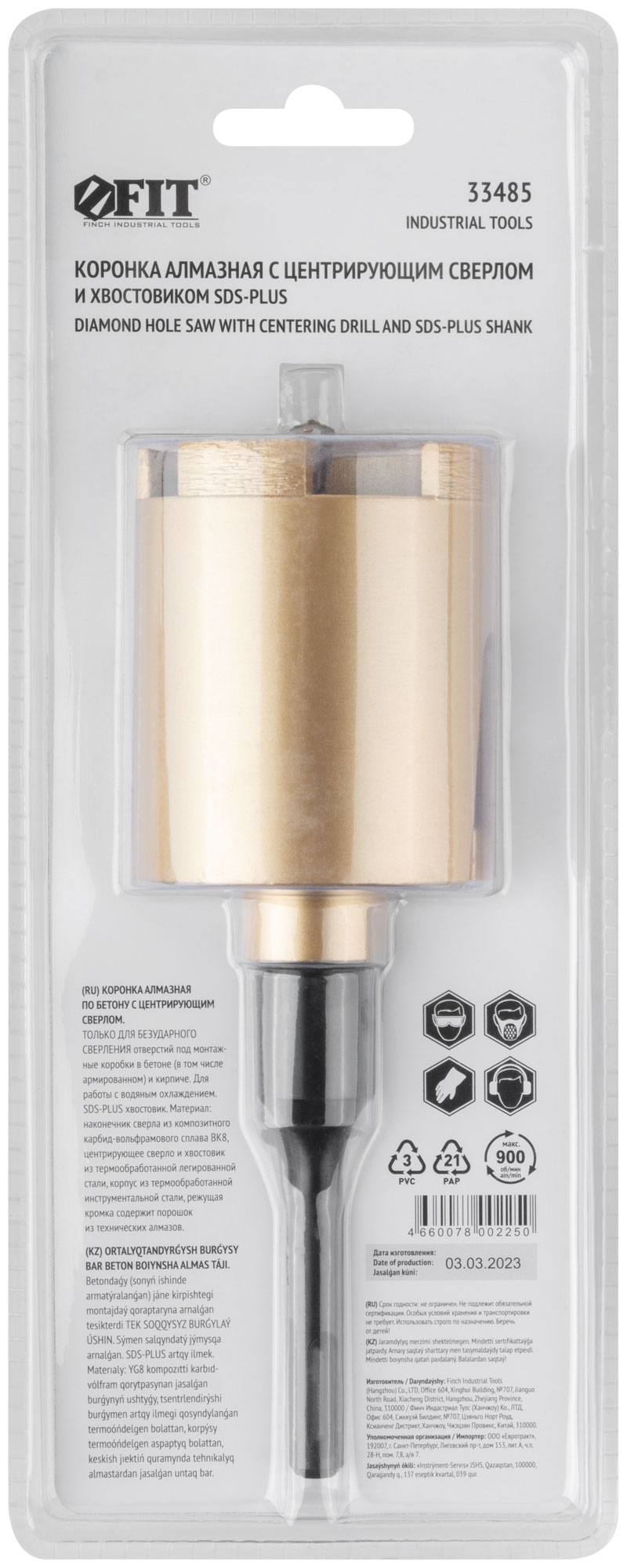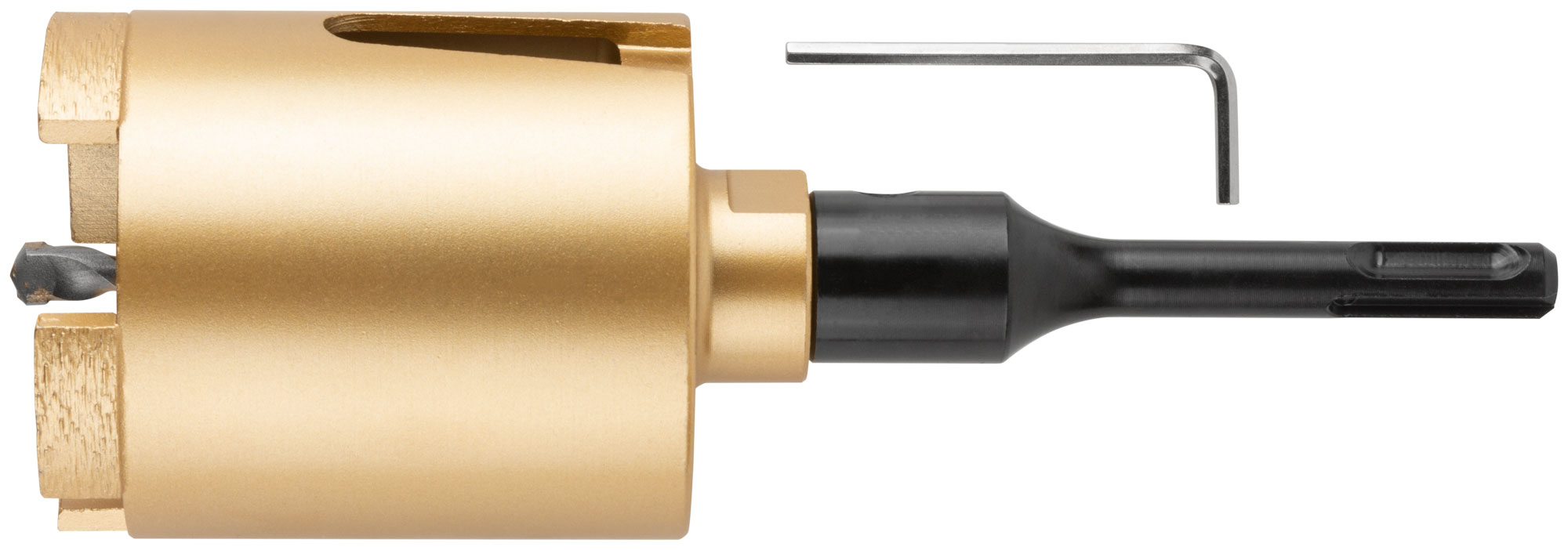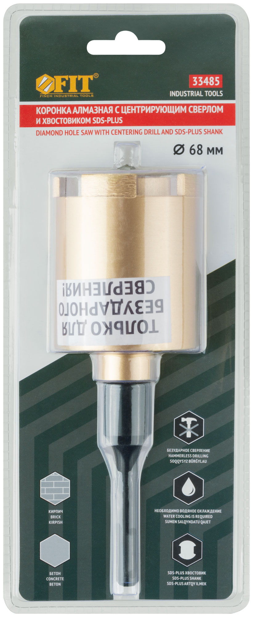 Коронка алмазная с центрирующим сверлом и хвостовиком SDS-PLUS. Для безударного сверления отверстий под монтажные коробки в бетоне и кирпиче. Для работы с водяным охлаждением. Материал: корпус из инструментальной стали, хвостовик и центрирующее сверло из легированной стали, режущая кромка содержит порошок из технических алмазов. Упаковка: пластиковый подвес.