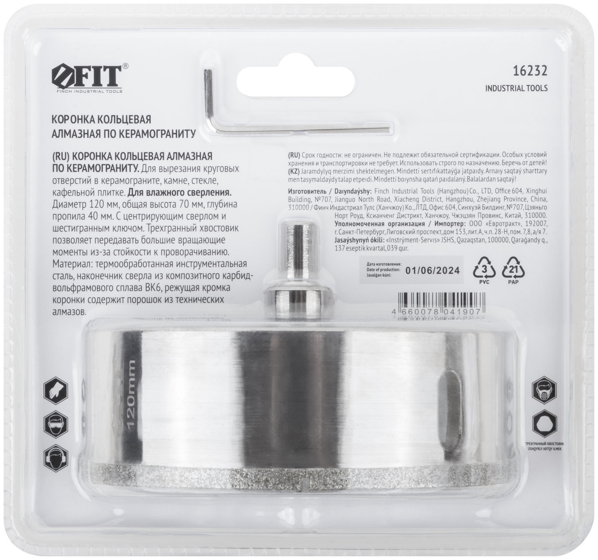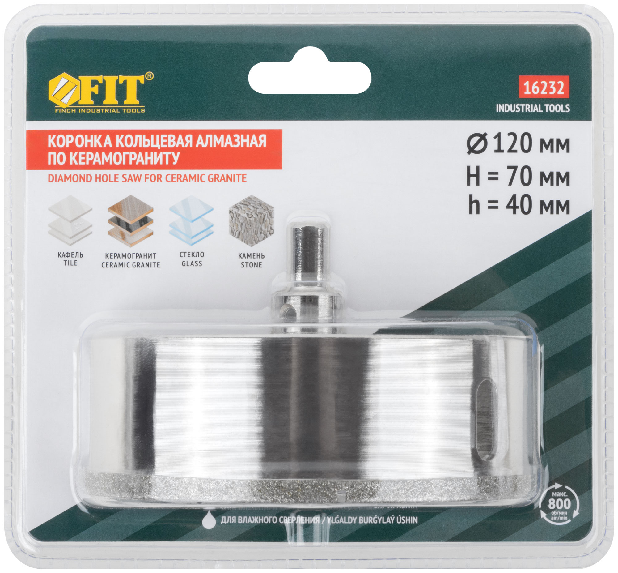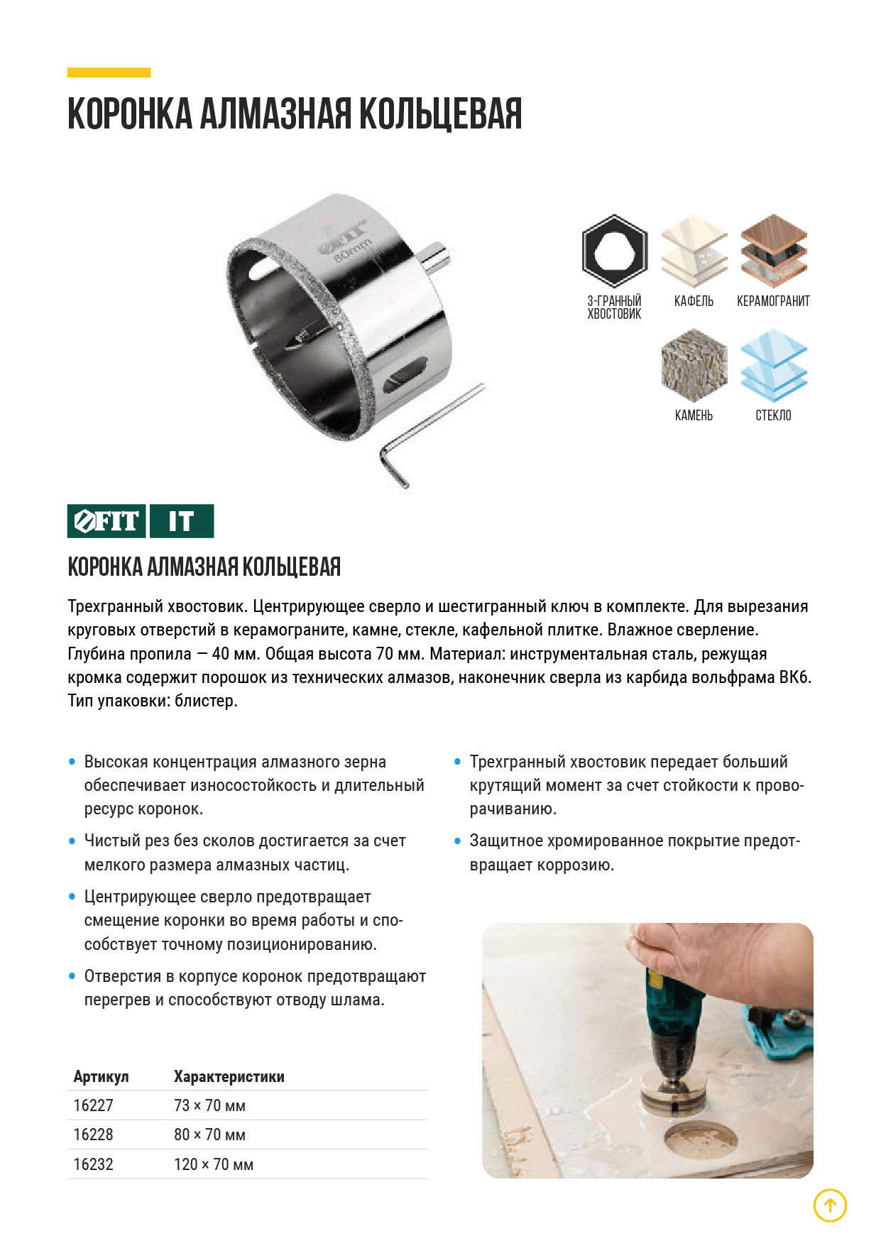 Трехгранный хвостовик. Идут в комплекте с центрирующим сверлом и шестигранным ключом. Для вырезания круговых отверстий в керамограните, камне, стекле, кафельной плитке. Влажное сверление. Глубина пропила 40 мм. Материал: инструментальная сталь, режущая кромка содержит порошок из технических алмазов. Упаковка: блистер.