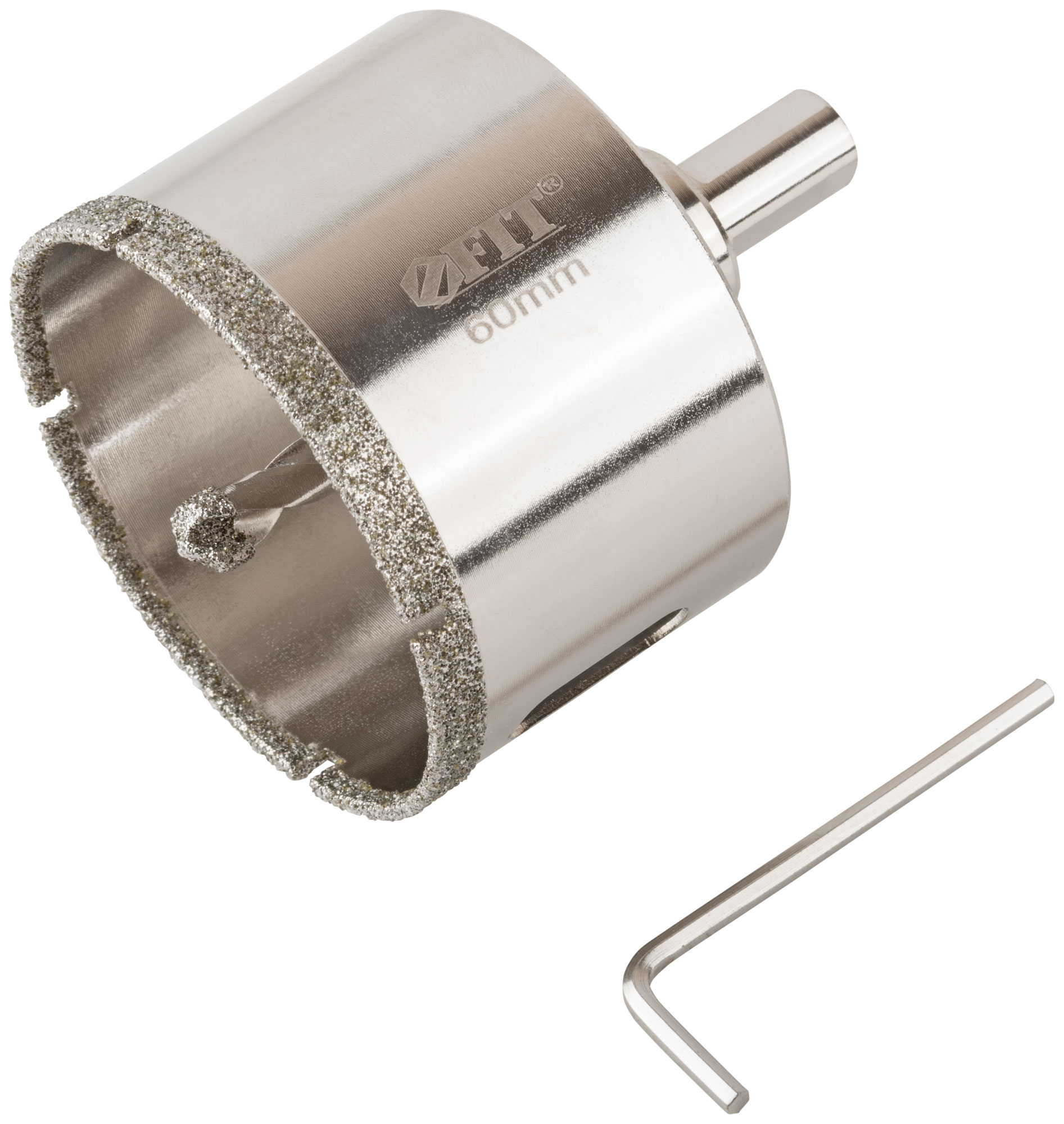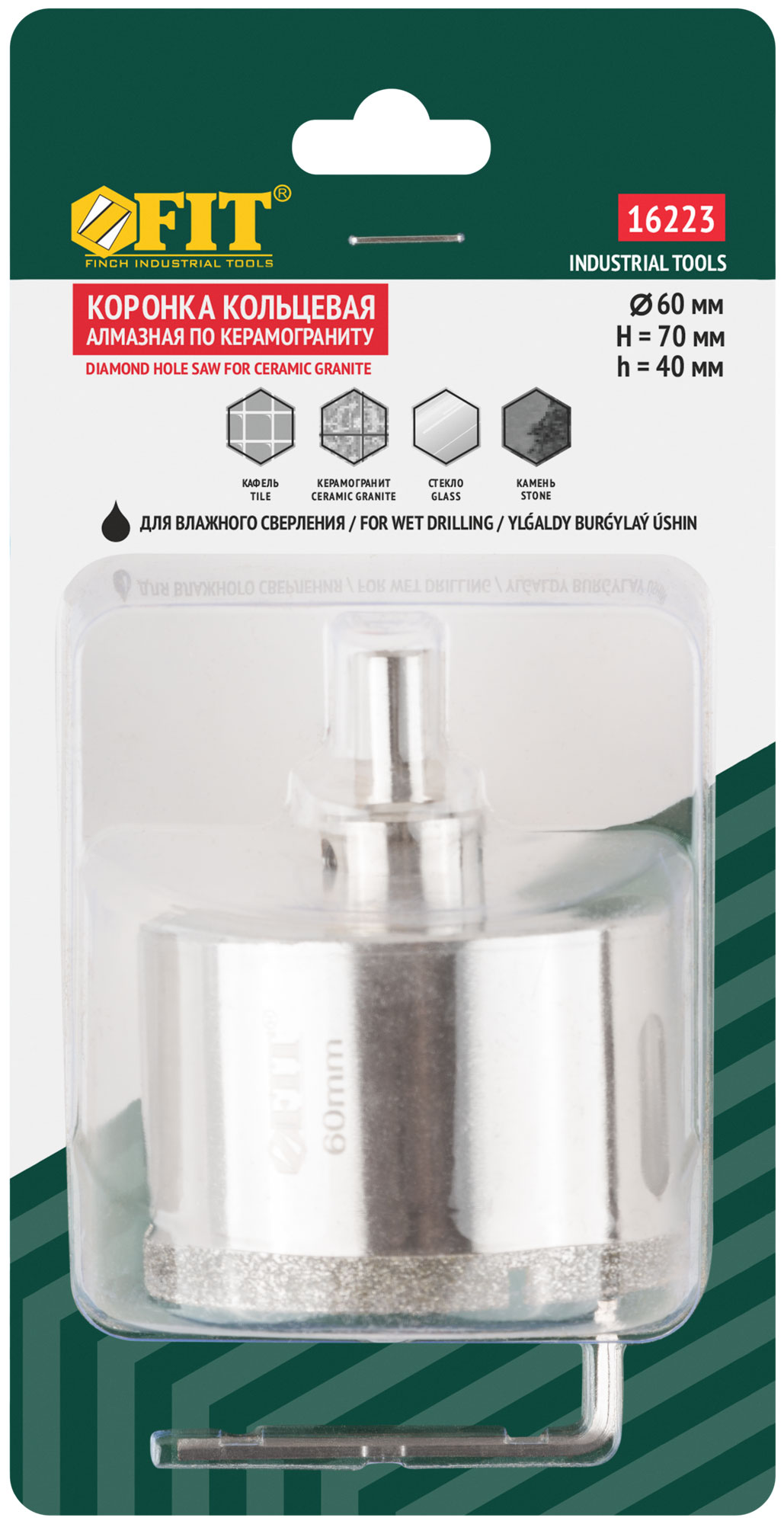 Трехгранный хвостовик. Идут в комплекте с центрирующим сверлом и шестигранным ключом. Для вырезания круговых отверстий в керамограните, камне, стекле, кафельной плитке. Влажное сверление. Глубина пропила 40 мм. Материал: инструментальная сталь, режущая кромка содержит порошок из технических алмазов. Упаковка: блистер.