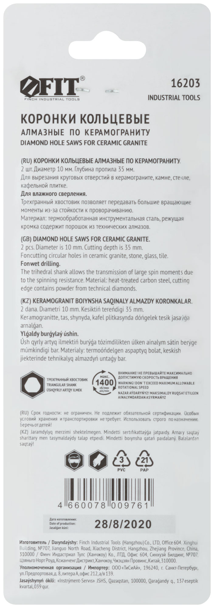 Трехгранный хвостик. Для вырезания круговых отверстий в керамограните, камне, стекле, кафельной плитке. Влажное сверление. Материал: инструментальная сталь, режущая кромка содержит порошок из технических алмазов. Упаковка: блистер.